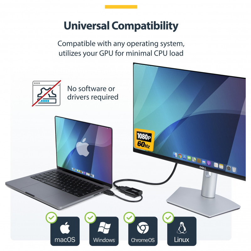 This universal video converter requires no drivers or software and is compatible with any operating system, including Windows, macOS, ChromeOS, and Linux. It works with HDMI-enabled laptops, desktops, tablets, and Chromebooks from all hardware platforms, such as Intel, Nvidia, and AMD. It supports resolutions up to 1920x1200 or 1920x1080 at 60Hz, utilizing the integrated or dedicated GPU for minimal CPU usage.