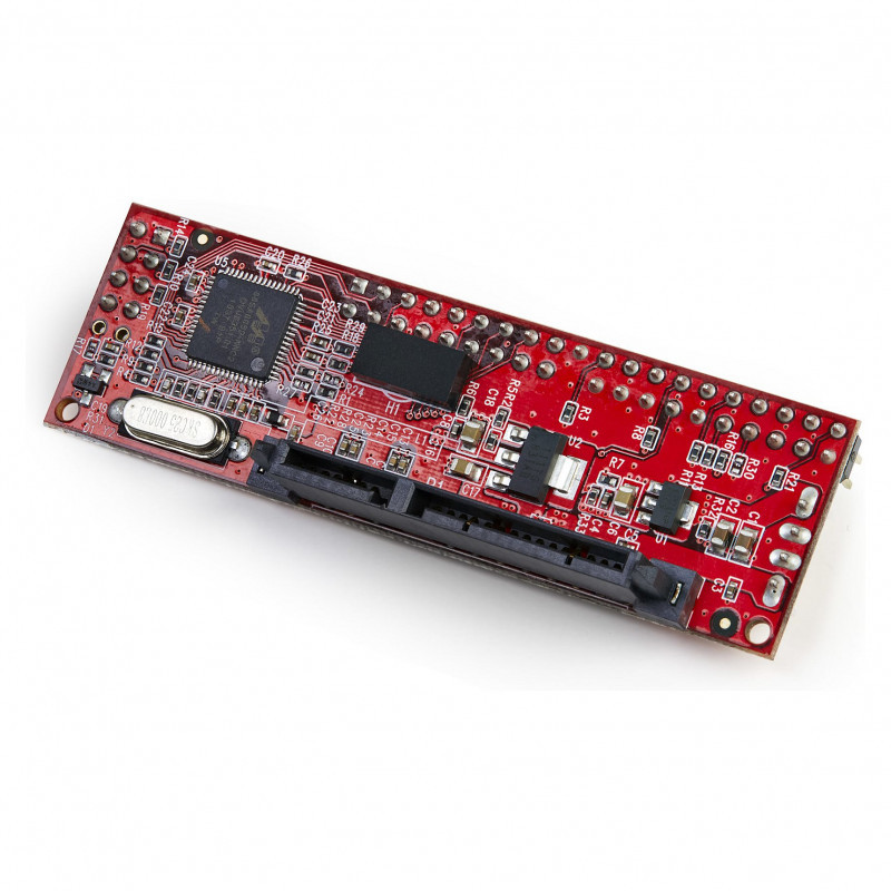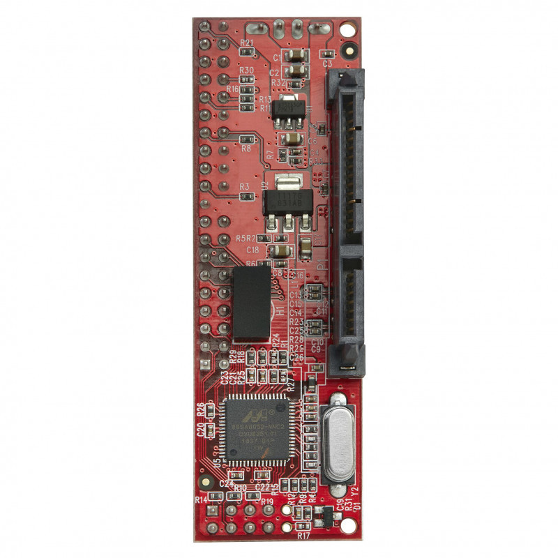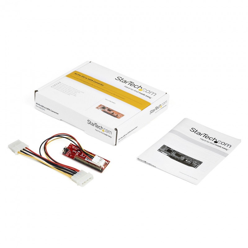 "StarTech.com IDE to SATA Hard Drive or Optical Drive Adapter - 40-Pin PATA to 2.5"" SATA HDD/SSD/ODD Converter. Host interface: IDE, Output interface: SATA, Connector(s): 1 x IDE (40 Pin; EIDE/PATA), 1 x SATA (7+15 pin), 1 x SP4 (4 pin). Product colour: Red, Certification: FCC, CE, TAA, REACH. Chipset: Marvell - 88SA8052, Data transfer rate (max): 0.133 Gbit/s, Logical block addressing (LBA) support: 48 bit. Width: 20 mm, Depth: 75.5 mm, Height: 23 mm. Package width: 175 mm, Package depth: 145 mm, Package height: 33 mm"\n"Connect your SATA Hard Drive or Blu-ray/DVD/CD-ROM Drive to an IDE motherboard