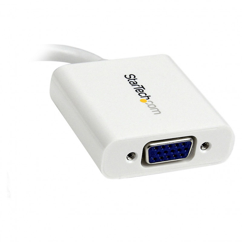 "StarTech.com Mini DisplayPort to VGA Adapter - Active Mini DP to VGA Converter - 1080p Video - mDP or Thunderbolt 1/2 Mac/PC to VGA Monitor/Projector/Display - mDP 1.2 to VGA Dongle - White. Cable length: 0.13 m, Connector 1: Mini DisplayPort, Connector 2: VGA (D-Sub). Compliance certificates: CE, RoHS. Weight: 28.5 g, Width: 45 mm, Depth: 180 mm. Package width: 200 mm, Package depth: 220 mm, Package height: 15 mm. Master (outer) case width: 270 mm, Master (outer) case length: 455 mm, Master (outer) case height: 355 mm"\n"Connect a VGA display to a Mini-DisplayPort®-equipped PC or Mac® computer