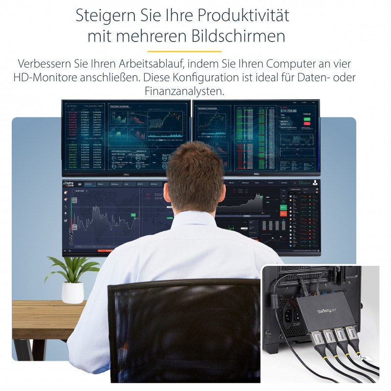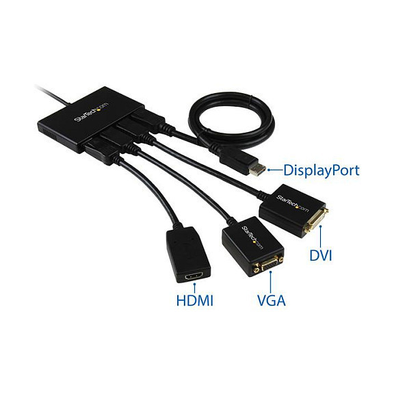 "StarTech.com 4-Port Multi Monitor Adapter - DisplayPort 1.2 MST Hub - 4x 1080p - DisplayPort Video Splitter for Extended Desktop Mode on Windows PCs Only - DP to Quad DP Monitors. Video port type: DisplayPort, Video out: 4x DisplayPort. Maximum resolution: 3840 x 2160 pixels, Product colour: Black, Housing material: Plastic. AC input voltage: 110 - 240 V, Input current: 0.5 A, Output voltage: 5 V. Width: 65 mm, Depth: 386 mm, Height: 15 mm. Package width: 241 mm, Package depth: 152 mm, Package height: 64 mm"\n"Use this adapter to connect four independent displays to a single DP 1.2 port