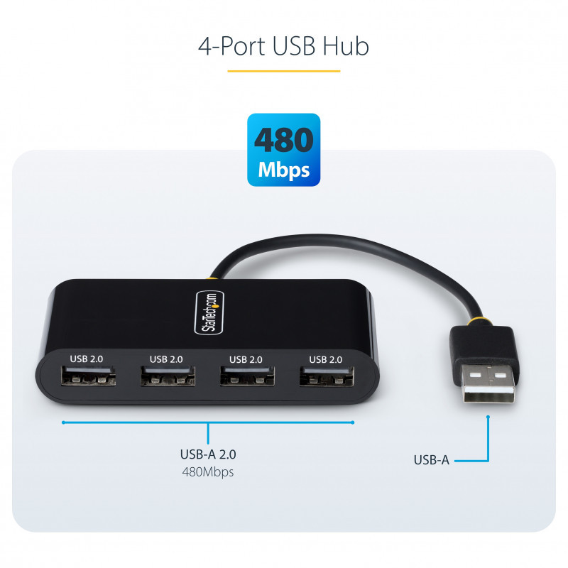 "StarTech.com ST4200MINI2-USB-HUB. Host interface: USB 2.0, Hub interfaces: USB 2.0 Type-A. Data transfer rate: 480 Mbit/s, Product colour: Black, Housing material: Acrylonitrile butadiene styrene (ABS). Power supply type: USB. Width: 40 mm, Depth: 80 mm, Height: 14 mm. Quantity per pack: 1 pc(s), Package width: 220 mm, Package depth: 128 mm"\n