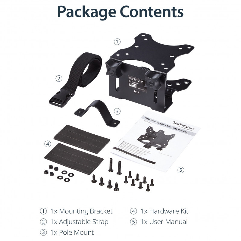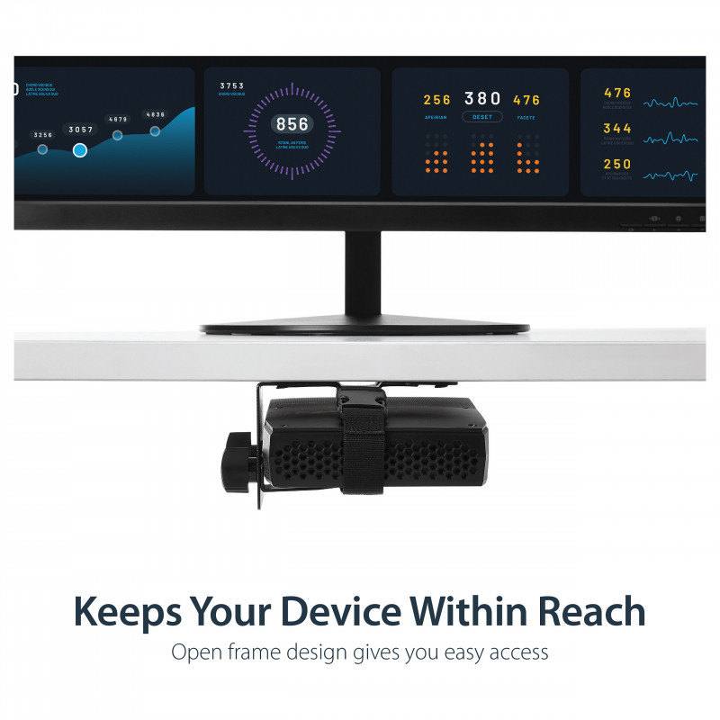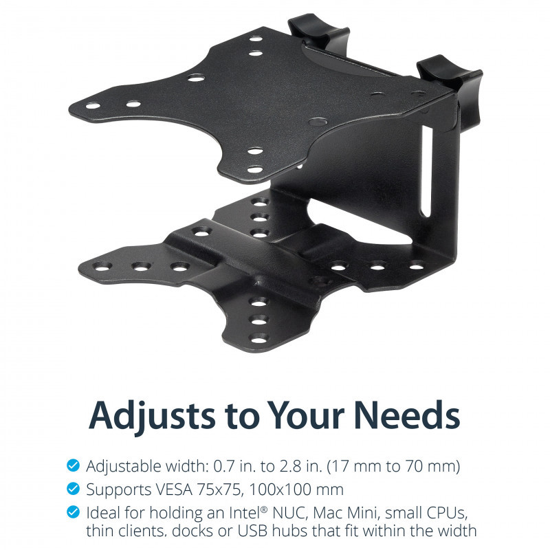 "StarTech.com Thin Client Mount - VESA Mounting Bracket. Type: Monitor stand-mounted CPU holder, Recommended chassis type: Small Desktop, Maximum weight capacity: 5 kg. Width: 80 mm, Width adjustment range: 17 - 70 mm, Depth: 118 mm"\n"Save space and neatly mount your docking station, thin client or USB hub to a VESA mount, behind your monitor, or under your desk