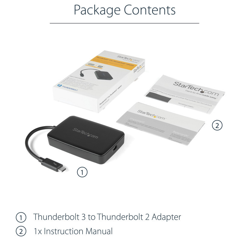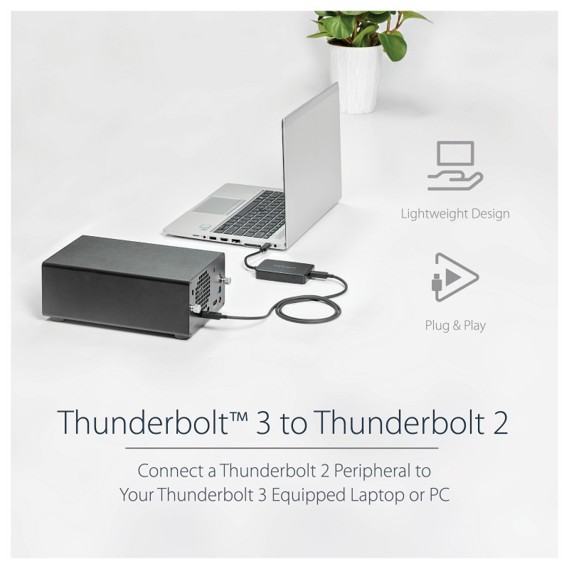 "StarTech.com Thunderbolt 3 to Thunderbolt 2 Adapter - TB3 Laptop to TB2 Displays & Devices - Thunderbolt 2 20Gbps or Thunderbolt 1 10Gbps Converter - Thunderbolt 3 Certified- Windows/Mac. Connector 1: Female, Connector 2: Male, Cable length: 0.2 m, Connector contacts plating: Nickel. Product colour: Black"\n"Use first-generation Thunderbolt and Thunderbolt 2 devices with your new Thunderbolt 3 computer