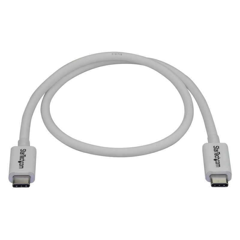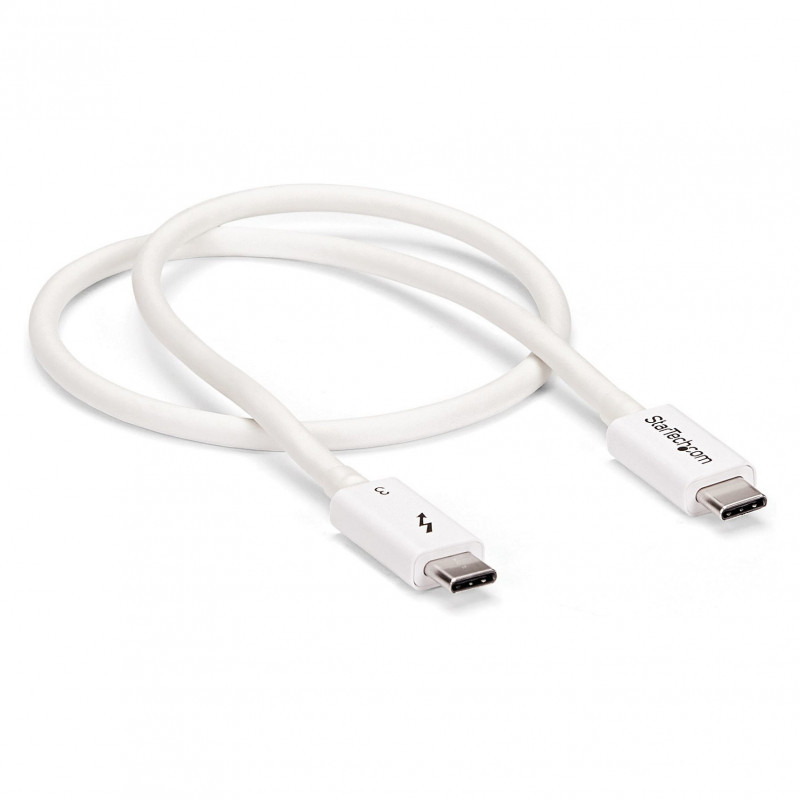 "StarTech.com Thunderbolt 3 Cable - 40Gbps - 0.5m - White - Thunderbolt, USB, and DisplayPort Compatible. Connector 1: Male, Connector 2: Male, Cable length: 0.5 m. Compliance certificates: RoHS. Weight: 21 g. Quantity per pack: 1 pc(s), Package width: 124 mm, Package depth: 221 mm. Products per master (outer) case: 60 pc(s), Master (outer) case length: 442 mm, Master (outer) case width: 299 mm"\n"Provide four times the data transfer speed of any other cable type, enable dual 4K 60Hz video, and power your devices with a single cable