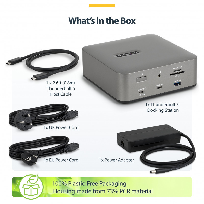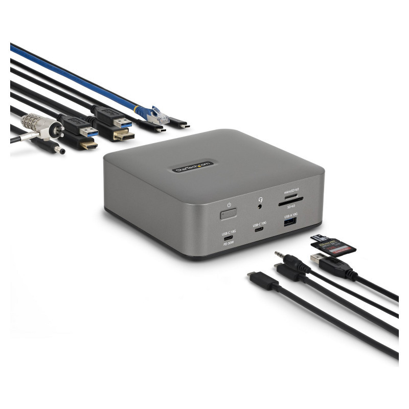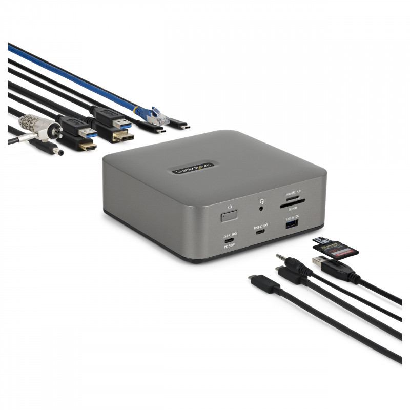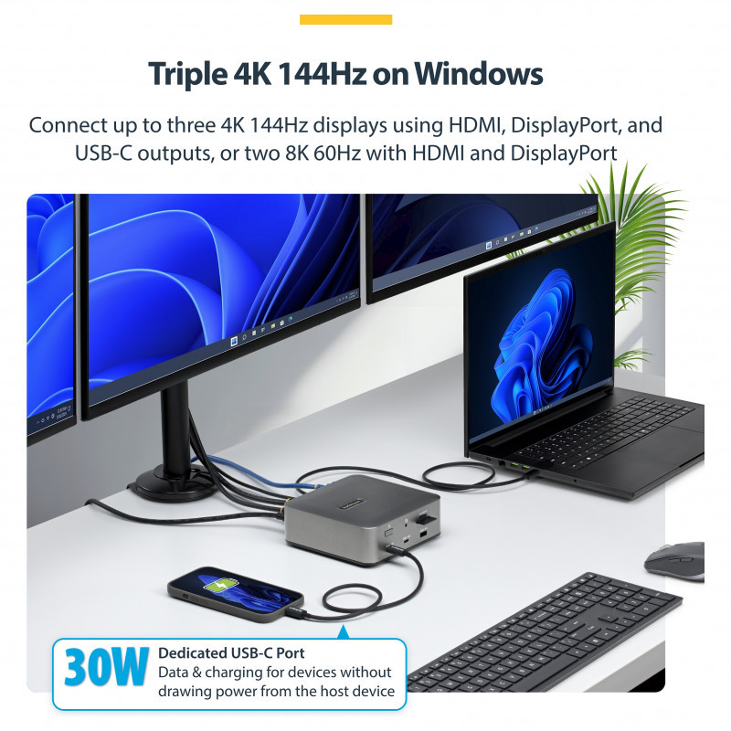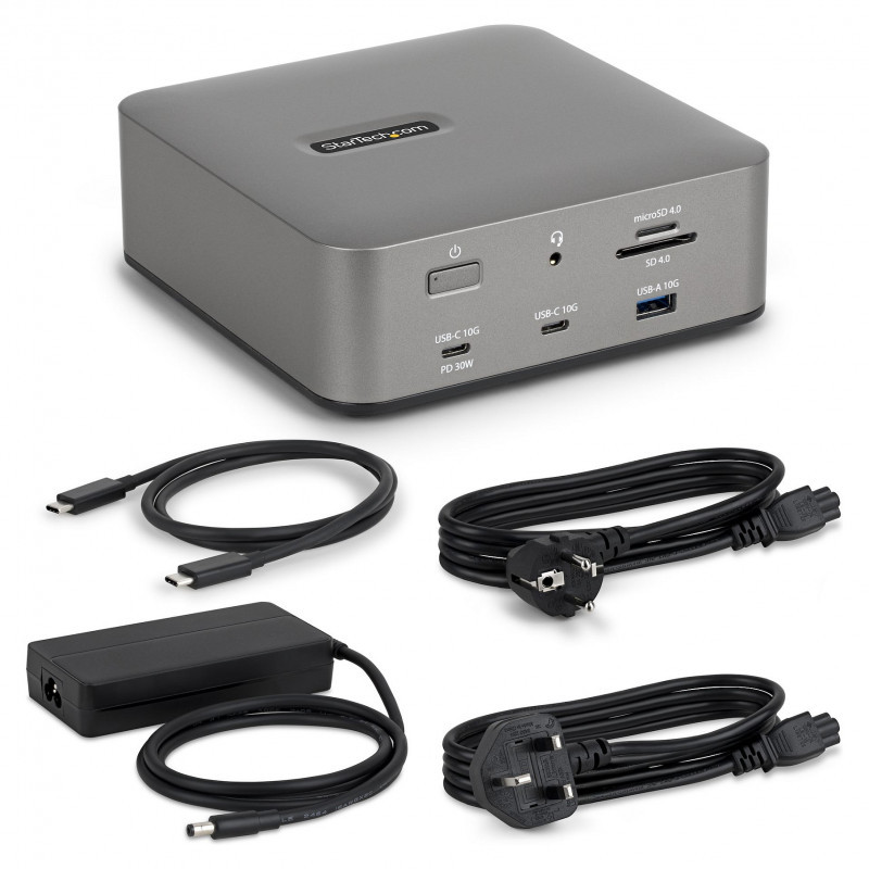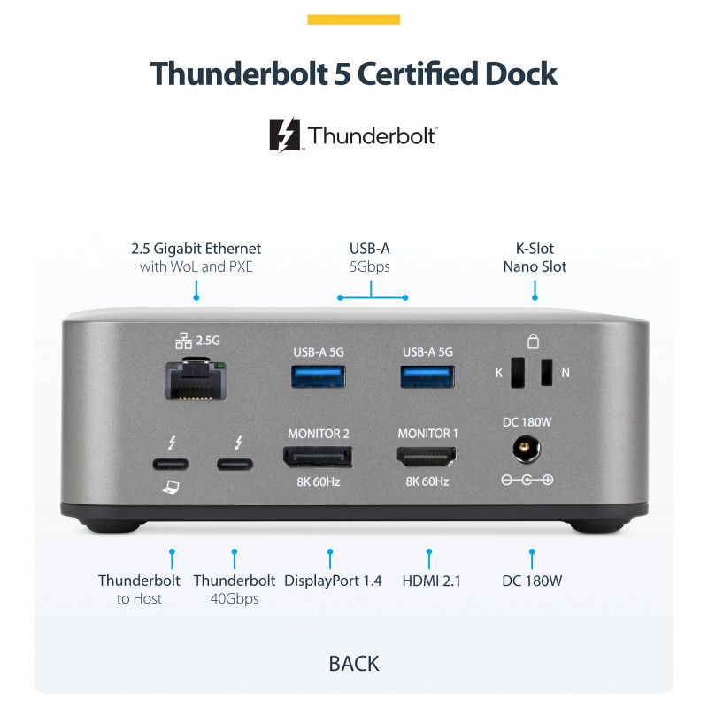 "StarTech.com Thunderbolt 5 Docking Station, DP / HDMI, Triple Monitor Dock up to 4K 144Hz or Dual 8K 60Hz, 5x USB Ports, 140W Laptop Charging. Connectivity technology: Wired, Host interface: Thunderbolt 5, USB Power Delivery up to: 140 W. Ethernet LAN data rates: 10,100,1000,2500 Mbit/s, Networking standards: IEEE 802.3bz. Product colour: Grey, Compatible memory cards: MicroSD (TransFlash), MicroSDHC, MicroSDXC, SD, SDHC, SDXC, Data transfer rate: 40 Gbit/s. Output voltage: 20 V, Output current: 9 A. Windows operating systems supported: Windows 10, Windows 10 Education, Windows 10 Education x64, Windows 10 Enterprise, Windows 10..., Mac operating systems supported: Mac OS X 15.0 Sequoia"\n"Transform your Thunderbolt 5 or USB4 laptop into a high-resolution, multi-monitor workstation