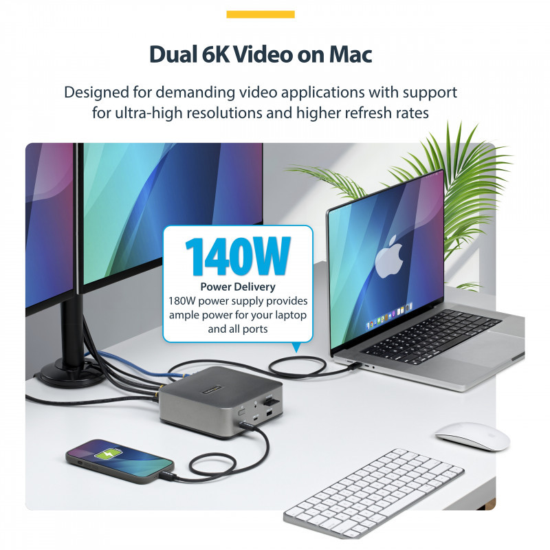 Connect up to three 4K 144Hz displays using a combination of HDMI, DisplayPort, and USB-C outputs or dual 8K 60Hz via HDMI and DisplayPort. The docking station includes an 180W power adapter that can supply up to 140W to charge high-performance laptops such as the MacBook Pro M4. A dedicated 30W USB-C port provides data connectivity and charging for phones or tablets without drawing power from the host computer.
