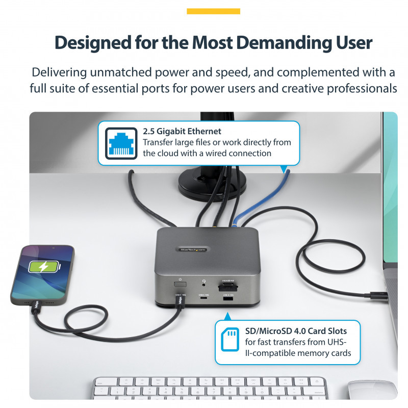 Enjoy faster cloud access, file transfers, and virtual collaboration with the wired 2.5G Ethernet RJ45 port. Driverless dock is compatible out of the box with Windows 11 and macOS 15 / 26 systems that feature Thunderbolt 5, 4, or USB4 connectivity, helping ensure IT-managed deployments stay efficient and consistent.