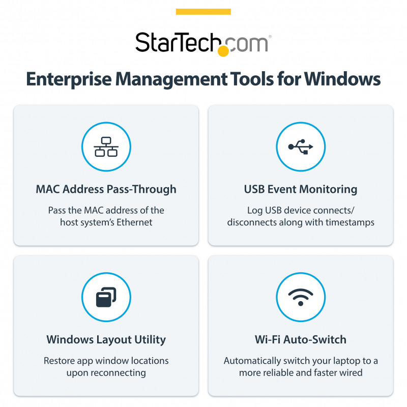StarTech.com Connectivity Tools offer practical utilities to support device management and increase productivity in modern IT environments. With features such as MAC address pass-through, Wi-Fi auto-switch, and USB device monitoring, the software helps IT teams streamline deployment and enhance security across diverse setups.