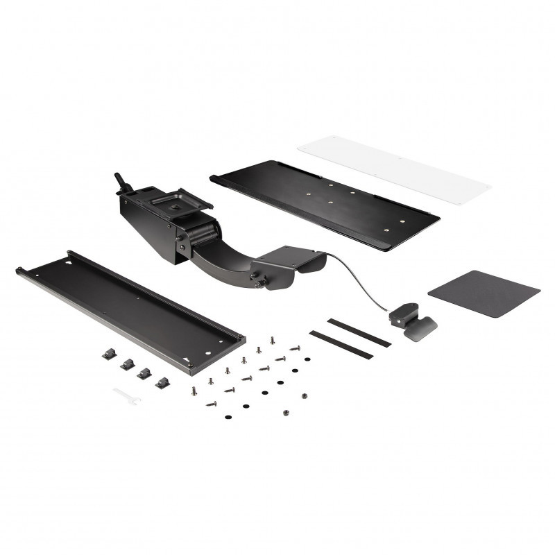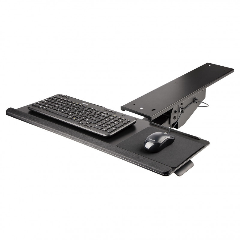 "StarTech.com Under Desk Keyboard Tray - Full Motion & Height Adjustable Keyboard and Mouse Tray, 10""x26"" Platform - Ergonomic Desk Mount Computer Keyboard Tray with Mouse Pad & Wrist Rest. Product colour: Black, Maximum weight per keyboard tray: 2000 kg, Frame material: Steel. Width: 710 mm, Depth: 670 mm, Height: 145 mm. Package width: 750 mm, Package depth: 285 mm, Package height: 205 mm. Compliance certificates: CE, RoHS. Master (outer) case length: 285 mm, Products per master (outer) case: 1 pc(s), Master (outer) case height: 205 mm"\n"Under-Desk Keyboard Tray | Adjustable | Wrist Rest & Mouse Pad
