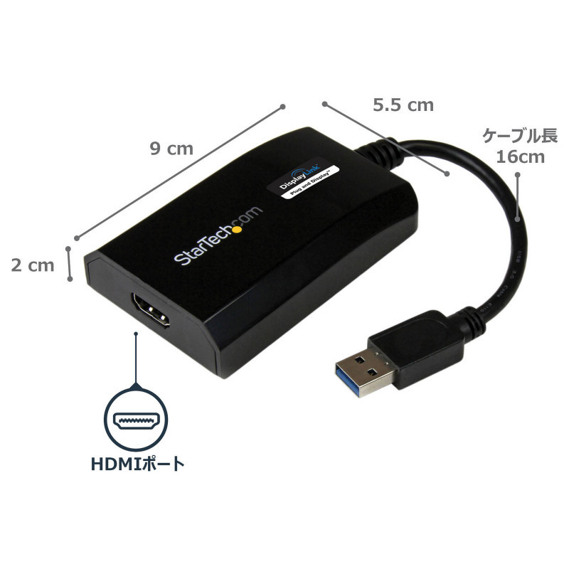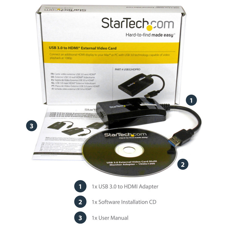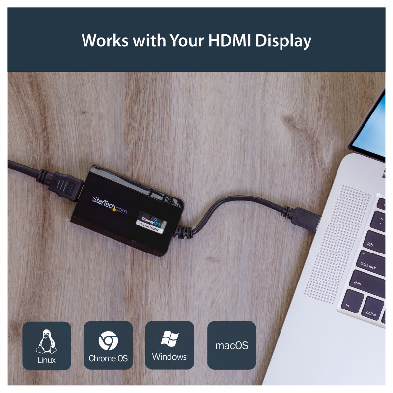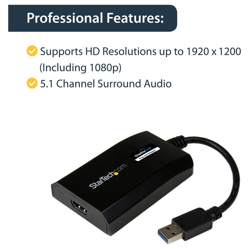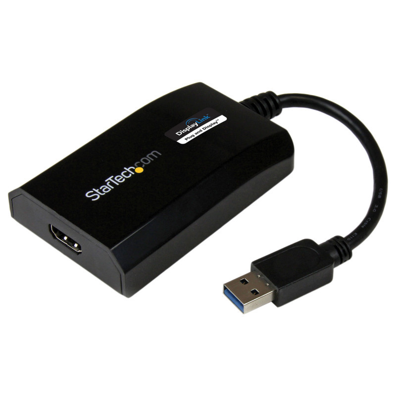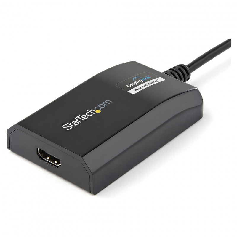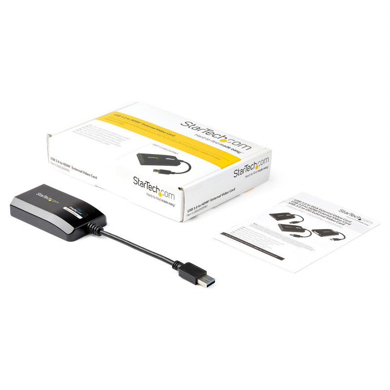 "StarTech.com USB 3.0 to HDMI Adapter - DisplayLink Certified - 1080p (1920x1200) - USB Type-A to HDMI Display Adapter Converter for Monitor - External Video & Graphics Card - Windows/Mac. USB version: 3.2 Gen 1 (3.1 Gen 1), USB connector type: USB Type-A, USB connector gender: Male. Product colour: Black, Housing material: Plastic. Windows operating systems supported: Windows 10, Windows 10 Education, Windows 10 Education x64, Windows 10 Enterprise, Windows 10..., Mac operating systems supported: Mac OS X 10.10 Yosemite, Mac OS X 10.11 El Capitan, Mac OS X 10.12 Sierra, Mac OS X 10.14 Mojave,..., Linux operating systems supported: Ubuntu 14.04, Ubuntu 16.04, Ubuntu 18.04 LTS. Width: 55 mm, Depth: 90 mm, Height: 20 mm. Package width: 145 mm, Package depth: 212 mm, Package height: 40 mm"\n"USB 3.0 External Video & Graphics Card | Multi-Monitor | USB-Powered | Supports Mac & Windows®