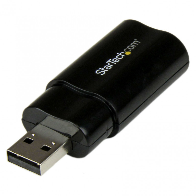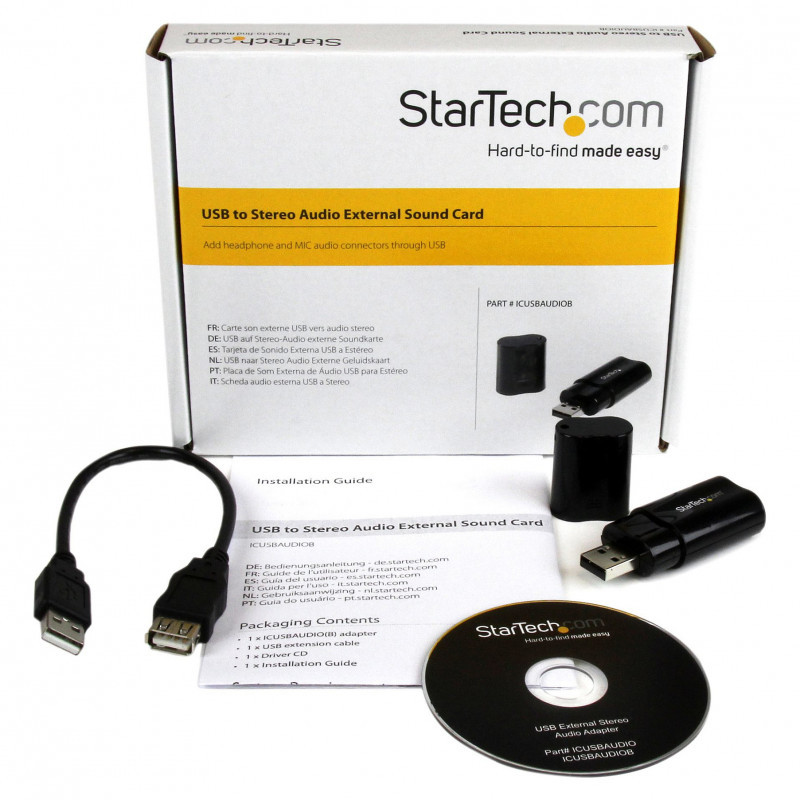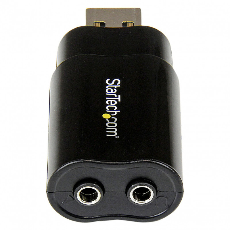 "StarTech.com USB Stereo Audio Adapter External Sound Card. Host interface: USB, Headphone connectivity: 3.5 mm. Chipset: C-Media CM108AH, Product colour: Black, Certification: RoHS, CE, FCC, TAA. Windows operating systems supported: Windows 10, Windows 10 Education, Windows 10 Education x64, Windows 10 Enterprise, Windows 10..., Mac operating systems supported: Mac OS X 10.10 Yosemite, Mac OS X 10.11 El Capitan, Mac OS X 10.12 Sierra, Mac OS X 10.13 High.... Weight: 14 g, Width: 27 mm, Depth: 62 mm. Server operating systems supported: Windows Server 2012, Windows Server 2012 R2, Windows Server 2016, Windows Server 2019, Housing material: Plastic"\n"Add headphone and MIC audio connectors through USB