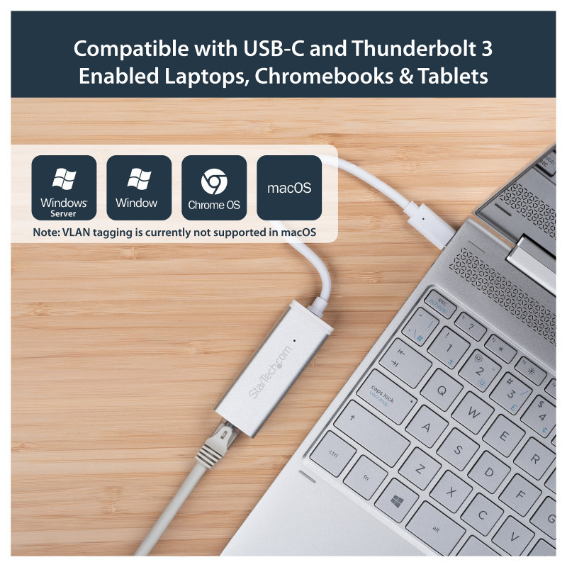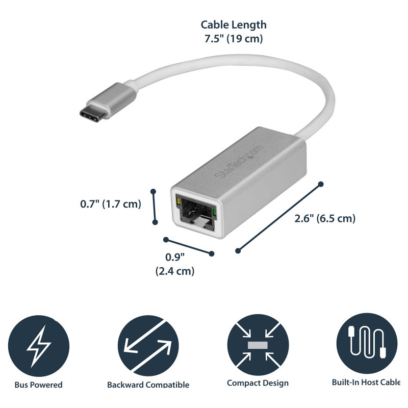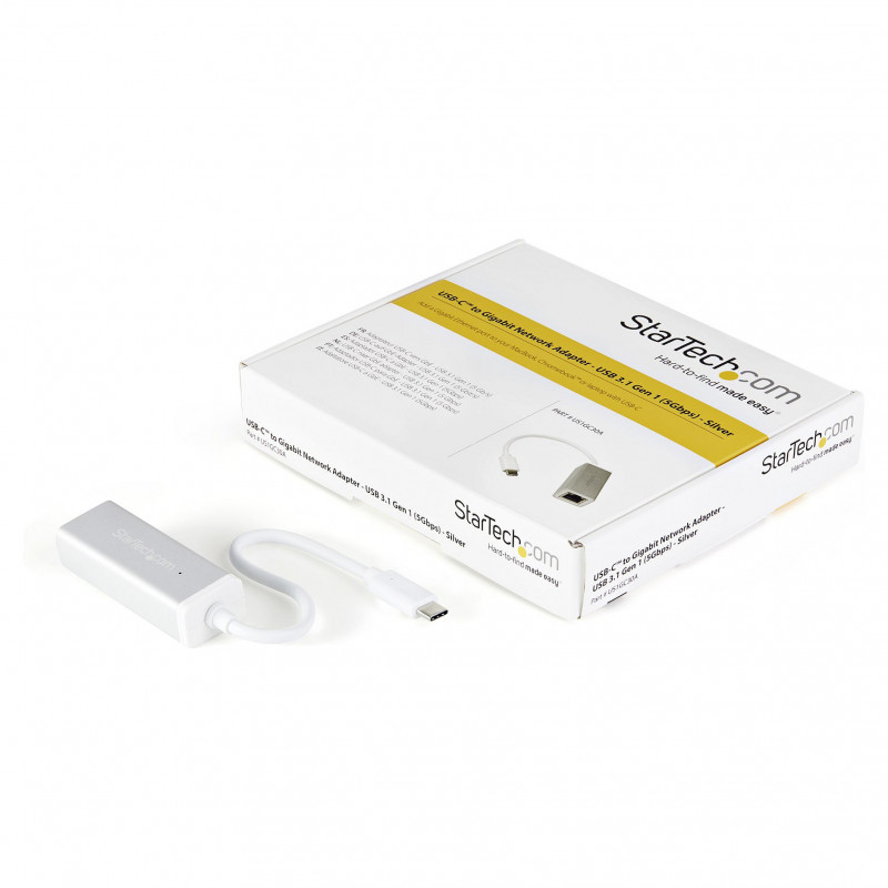 "StarTech.com USB-C to Gigabit Network Adapter - Silver. Connectivity technology: Wired, Host interface: USB, Interface: Ethernet. Maximum data transfer rate: 5000 Mbit/s. USB powered. Product colour: Silver"\n"Use this sleek aluminum converter to add a Gb Ethernet port to your MacBook, Chromebook or laptop with USB Type-C
