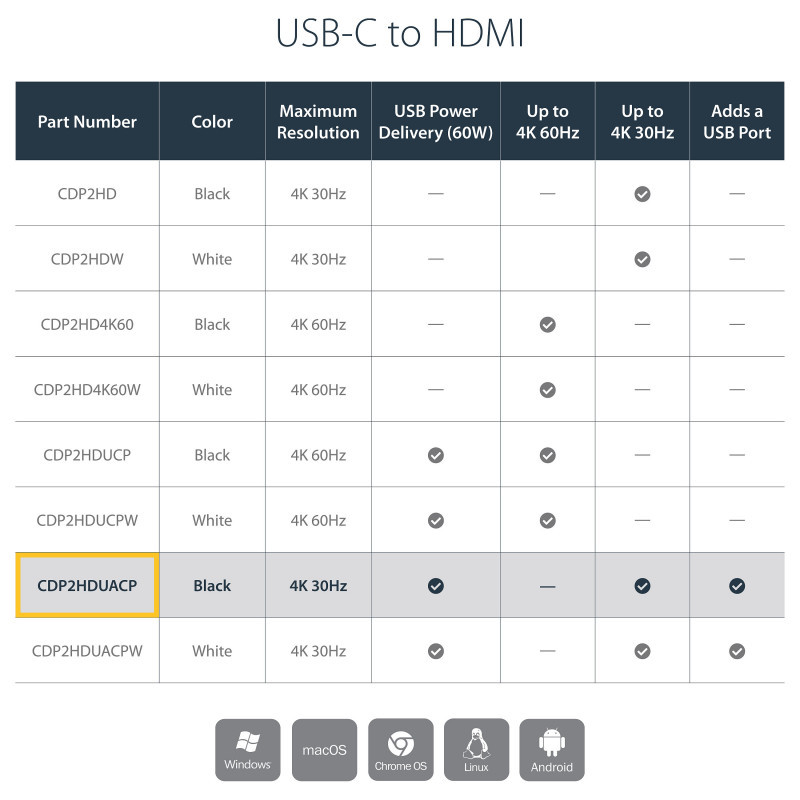 This USB-C to 4K HDMI adapter connects an HDMI display to your laptop or MacBook with USB Type-C. The USB C to HDMI adapter features USB Power Delivery, so you can power your laptop while outputting video, using the same USB-C port. The adapter is also available in white (CDP2HDUCPW), so you can choose an adapter that matches the style of your laptop.