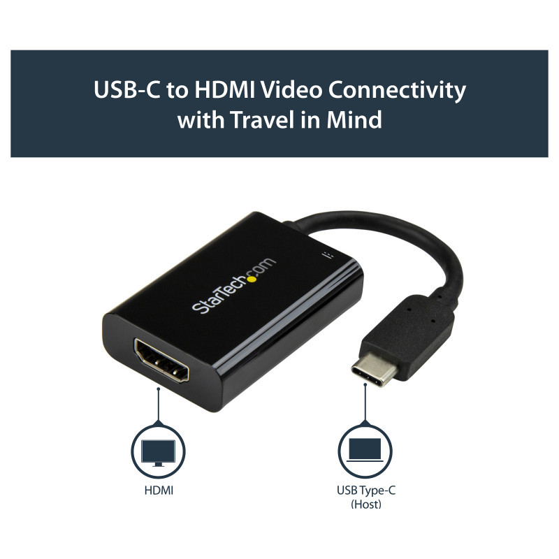 "StarTech.com USB C to HDMI 2.0 Adapter with Power Delivery - 4K 60Hz USB Type-C to HDMI Display Video Converter - 60W PD Pass-Through Charging Port - Thunderbolt 3 Compatible - Black. USB connector type: USB Type-C, USB connector gender: Male, Maximum resolution: 3840 x 2160 pixels. Product colour: Black, Housing material: Plastic. Width: 33 mm, Depth: 50 mm, Height: 13 mm. Package width: 146 mm, Package depth: 174 mm, Package height: 32 mm. Products per master (outer) case: 40 pc(s), Master (outer) case width: 334 mm, Master (outer) case length: 362 mm"\n"USB Type C to HDMI Adapter | Thunderbolt 3 Compatible | 4K 60 Hz