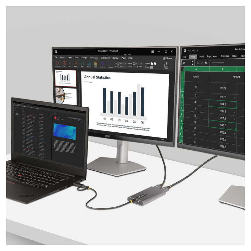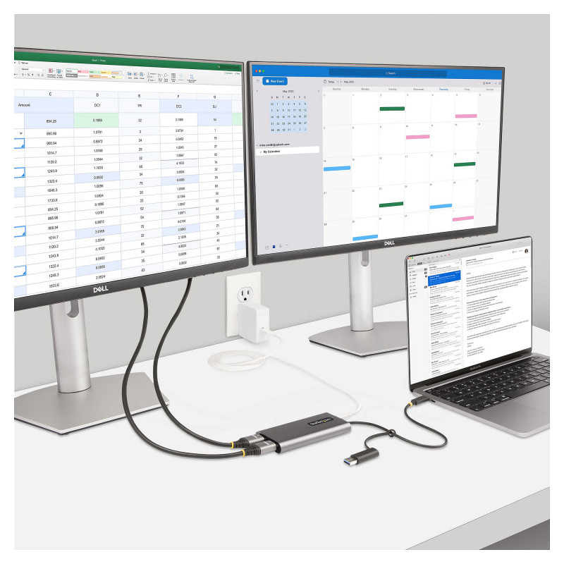The USB multi-monitor adapter is DisplayLink Certified and supports high-performance dual-monitor 4K 60Hz video resolutions with an integrated DisplayLink DL-6950 Controller.