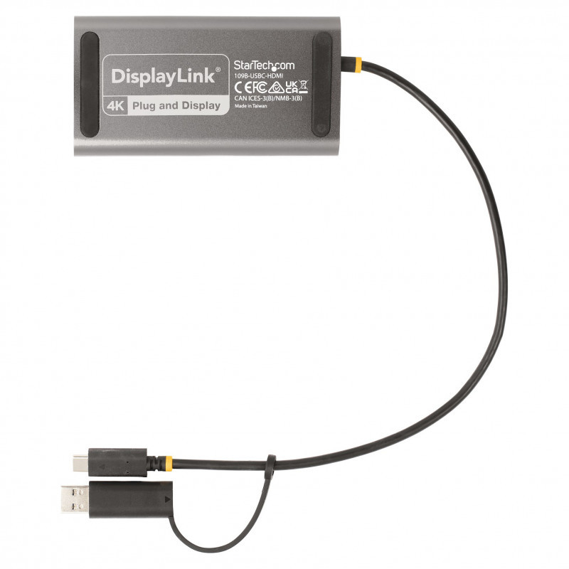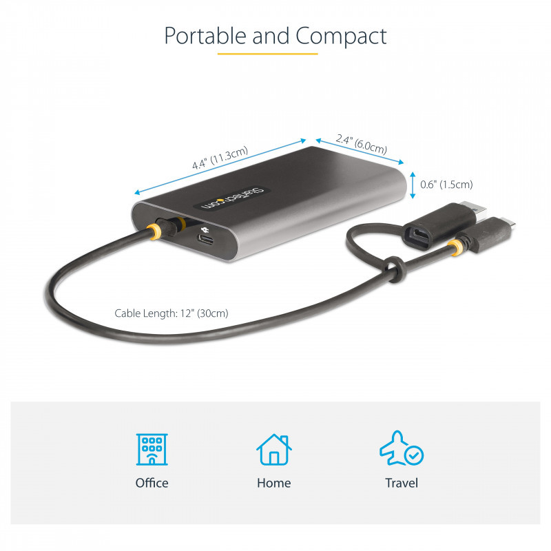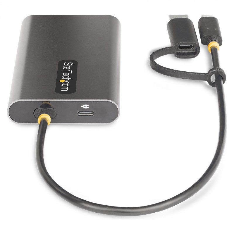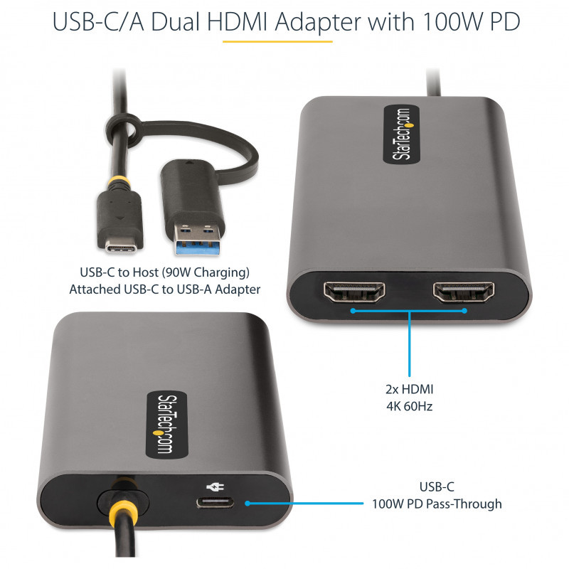"StarTech.com USB-C to Dual-HDMI Adapter - USB-C or A to 2x HDMI - 4K 60Hz - 100W Power Delivery Pass-Through - 1ft (30cm) Built-in Cable - USB to HDMI Multi-Monitor Converter for Laptop - TAA. USB version: 3.2 Gen 1 (3.1 Gen 1), USB connector type: USB Type-C, USB connector gender: Male. Product colour: Grey, Housing material: Aluminium, Plastic. Windows operating systems supported: Windows 10, Windows 10 Education, Windows 10 Education x64, Windows 10 Enterprise, Windows 10..., Mac operating systems supported: Mac OS X 10.11 El Capitan, Mac OS X 10.12 Sierra, Mac OS X 10.14 Mojave, Mac OS X 10.15 Catalina,..., Linux operating systems supported: Ubuntu 18.04 LTS, Ubuntu 20.04 LTS. USB cable length: 0.3 m. Package width: 114 mm, Package depth: 60 mm, Package height: 16 mm"\n"Dual 4K 60Hz HDMI Output | Attached USB-C to USB-A Dongle