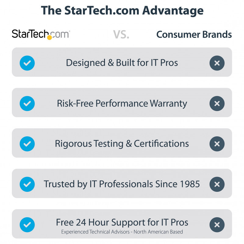 This product is backed for 3-years by StarTech.com, including free 24/5 multi-lingual technical assistance.