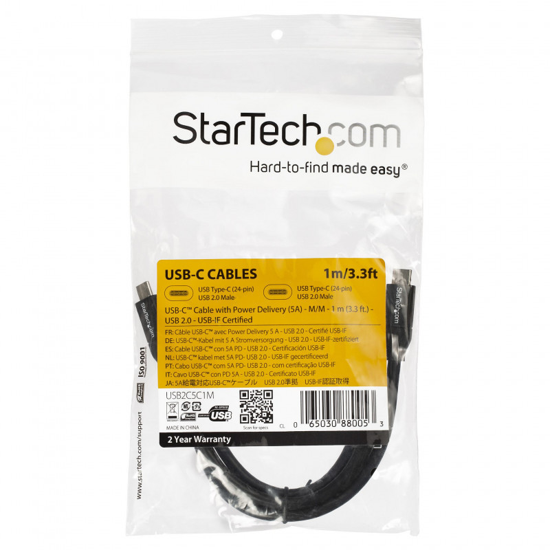 "StarTech.com USB-C to USB-C Cable w/ 5A PD - M/M - 1 m (3 ft.) - USB 2.0 - USB-IF Certified. Cable length: 1 m. Connector 1: USB C, Connector 2: USB C, USB version: USB 2.0, Maximum data transfer rate: 0.48 Gbit/s, Connector contacts plating: Nickel, Product colour: Black"\n"Power your USB Type-C devices