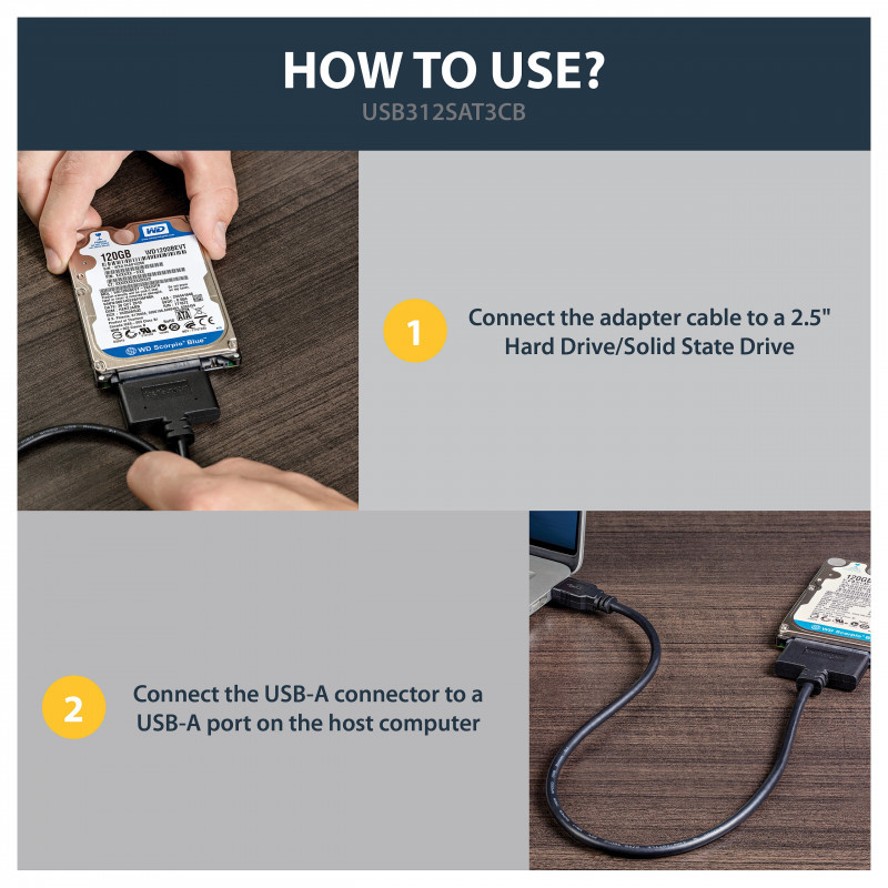 With the adapter cable, you can quickly swap hard drives without having to install your drives into an enclosure. You can copy or retrieve data from a 2.5"" SSD/HDD quickly with no additional accessories required. It gives you easy drive access for data migration, drive cloning and data backup applications, with the fast performance of USB 3.1 Gen 2.
