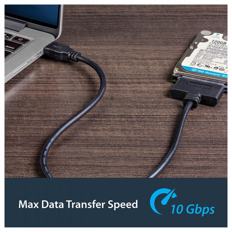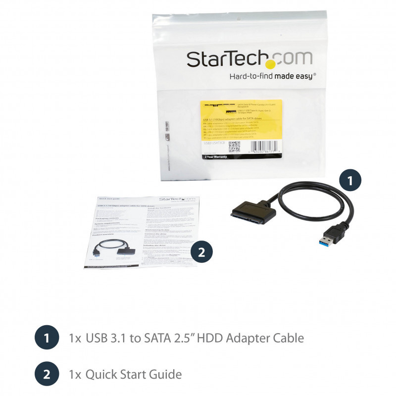 "StarTech.com USB 3.1 to 2.5"" SATA Hard Drive Adapter - USB 3.1 Gen 2 10Gbps with UASP External HDD/SSD Storage Converter. Connector 1: USB 3.1 A, Connector 2: SATA 7+15 pin, Cable length: 0.5 m. Product colour: Black"\n"Connect a 2.5"" SATA SSD/HDD to your computer using this USB 3.1 Gen 2 ultra-portable cable