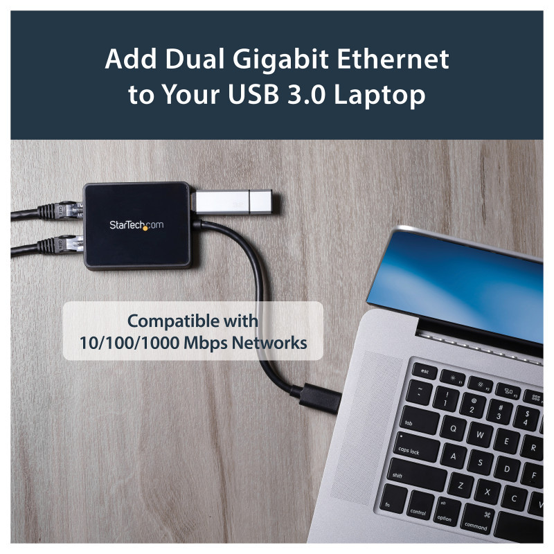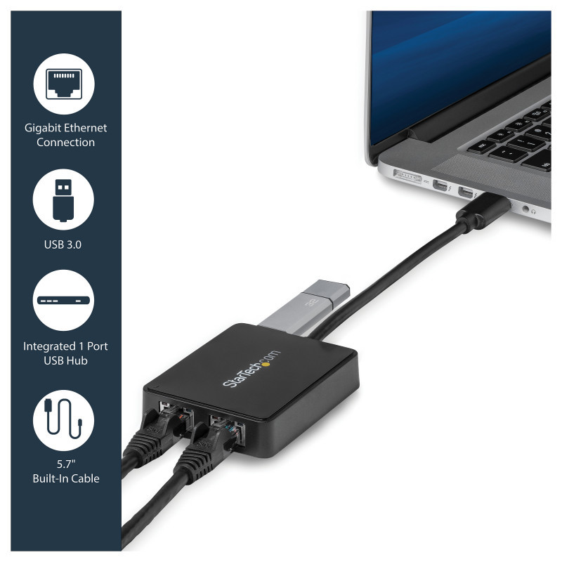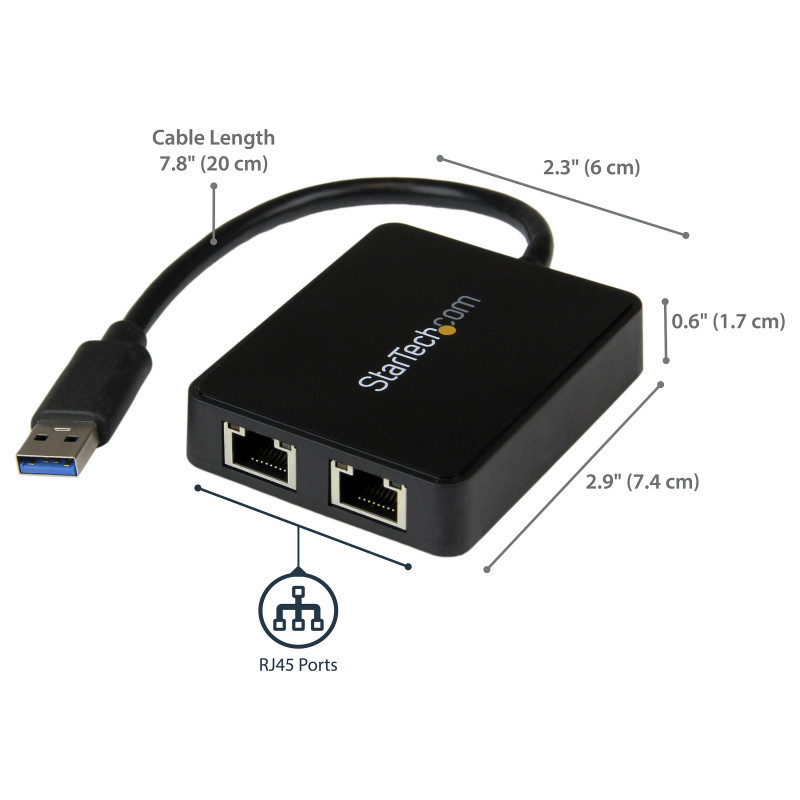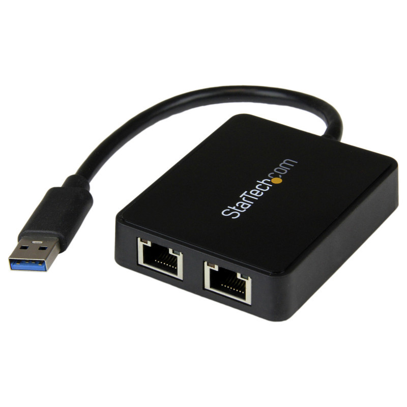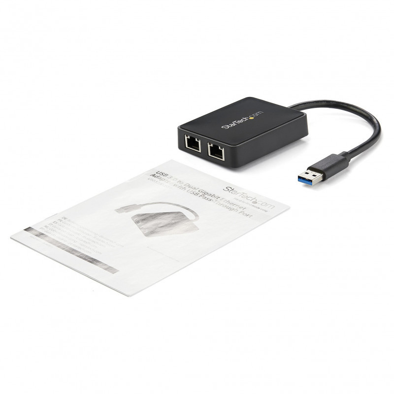 "StarTech.com USB 3.0 to Dual Port Gigabit Ethernet Adapter NIC w/ USB Port. Connectivity technology: Wired, Host interface: USB, Interface: Ethernet. Maximum data transfer rate: 5000 Mbit/s. USB powered. Product colour: Black"\n"Add two Gigabit Ethernet ports and a USB 3.0 pass-through port to your laptop through a single USB 3.0 port