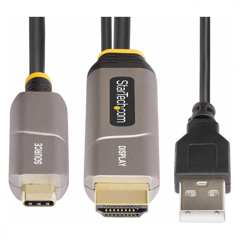 "StarTech.com 50ft (15.2m) USB-C to HDMI 2.0 Active Optical Cable (AOC), 4K 60Hz, CL3 Rated, Unidirectional USB Type-C to HDMI Adapter Cable. Cable length: 15.2 m, Connector 1: USB Type-C, Connector 2: HDMI Type A (Standard). Compliance certificates: Federal Communications Commission (FCC), RoHS. Cable diameter: 4.5 mm. Package width: 224 mm, Package depth: 234 mm, Package height: 39 mm. Master (outer) case width: 425 mm, Master (outer) case length: 465 mm, Master (outer) case height: 255 mm"\n"Connect a USB-C video source to an HDMI display, with support for HDR video