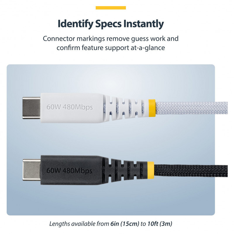 "StarTech.com 15cm (6in) White USB-C Charging Cable, 60W (3A) PD, Dual-Layer Braided Nylon/TPE Jacket, Rugged USB C Charging Cord, USB 2.0 Laptop Charger Cable. Cable length: 0.15 m. Connector 1: USB C, Connector 2: USB C, USB version: USB 2.0, Maximum data transfer rate: 0.48 Gbit/s, Connector contacts plating: Nickel, Product colour: White"\n"Connect a USB Type-C device to a USB-C wall charger or host computer