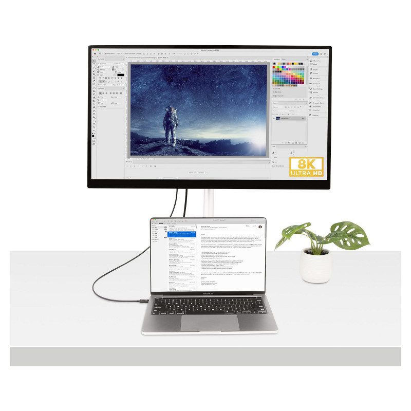 The cable supports full-8K 60Hz video and DisplayPort 1.4a, and is compatible with DisplayPort displays. Use it to connect a docking station to laptop, or a laptop to a display