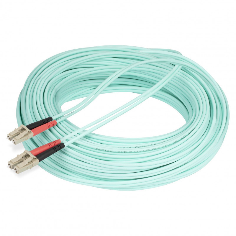 "StarTech.com 20m (65ft) LC/UPC to LC/UPC OM4 Multimode Fiber Optic Cable, 50/125µm LOMMF/VCSEL Zipcord Fiber, 100G, Low Insertion Loss - LSZH Fiber Jumper Cord. Cable length: 20 m, Fibre optic type: OM4, Connector 1: LC, Connector 2: LC, Core diameter: 50 µm, Full duplex"\n"LSZH Jacket | Aramid Fiber Sheath | Ideal for SANs, data servers, SFP+