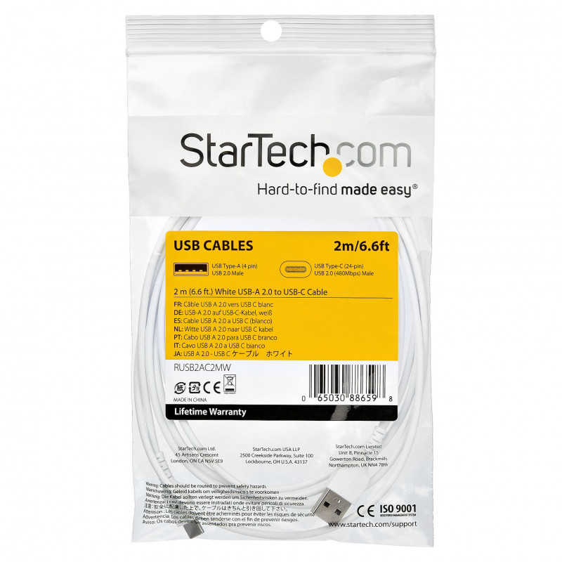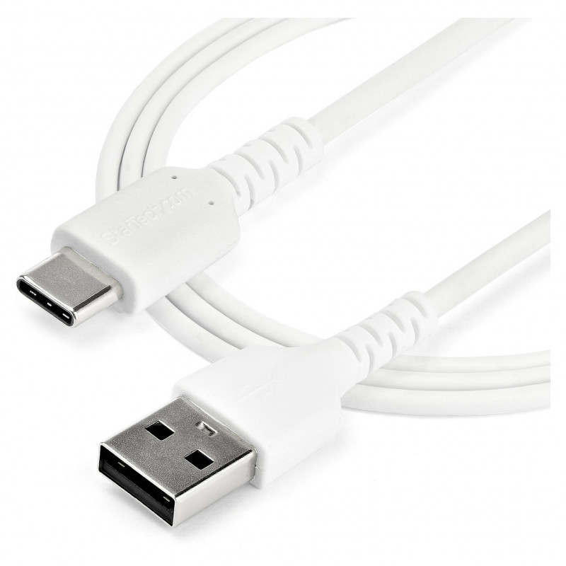 "StarTech.com 2m USB A to USB C Charging Cable - Durable Fast Charge & Sync USB 2.0 to USB Type C Data Cord - Rugged TPE Jacket Aramid Fiber M/M 3A White - Samsung S10, iPad Pro, Pixel. Cable length: 2 m. Connector 1: USB A, Connector 2: USB C, USB version: USB 2.0, Maximum data transfer rate: 0.48 Gbit/s, Connector contacts plating: Nickel, Product colour: White"\n"Connect and charge USB Type-C devices, including iPhone 15 and up, with this rugged USB-C to USB-A Cable