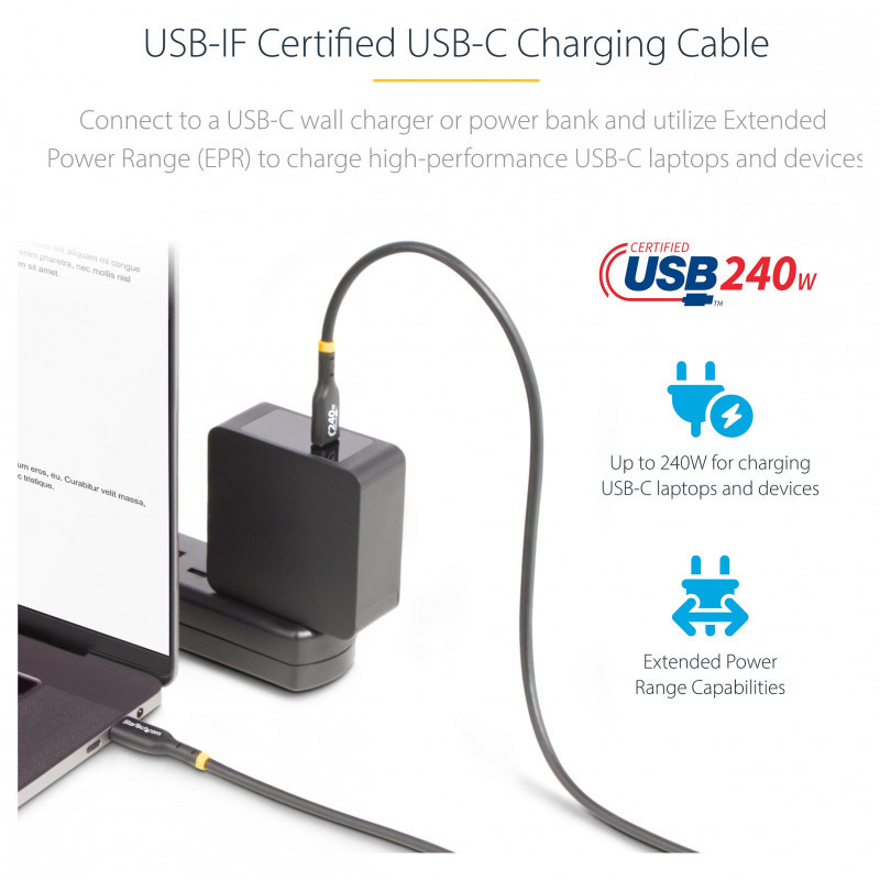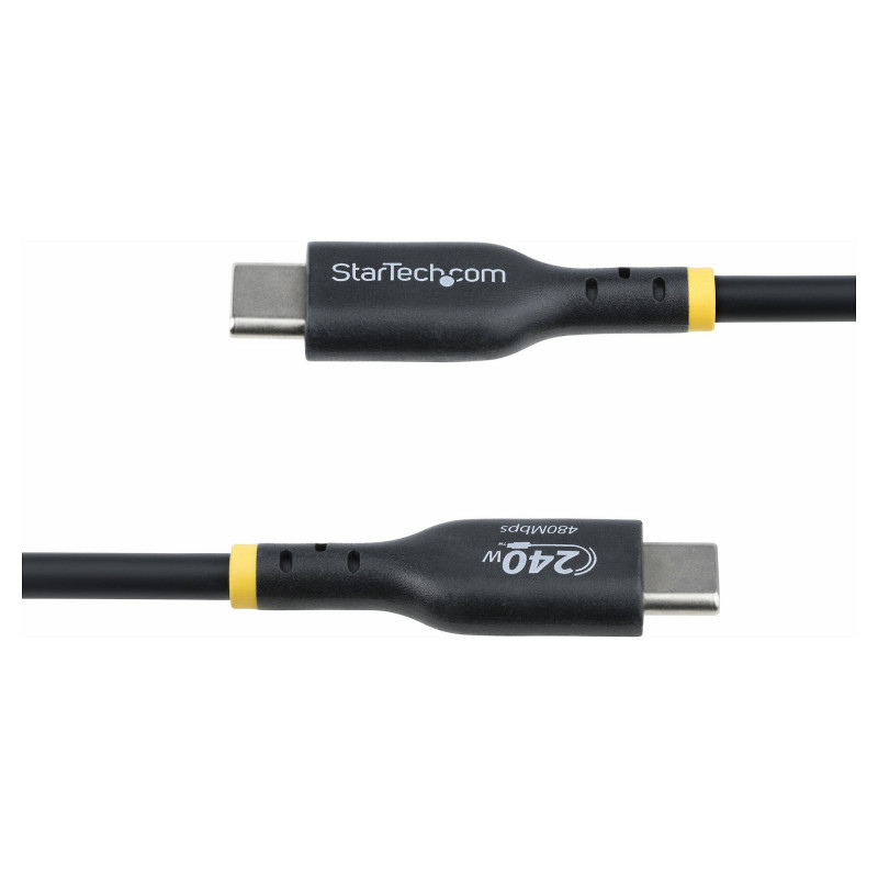 "StarTech.com 4m USB-C Charging Cable, USB-IF Certified USB C Cable, 240W PD EPR, USB 2.0 Type-C Laptop Charger Cord, USB-C Data Transfer Cable, TPE Jacket, M/M. Cable length: 4 m. Connector 1: USB C, Connector 2: USB C, USB version: USB 2.0, Maximum data transfer rate: 0.48 Gbit/s, Connector contacts plating: Nickel, Product colour: Black"\n"Charge high performance USB-C devices at up to 240W Extended Power Range (EPR)