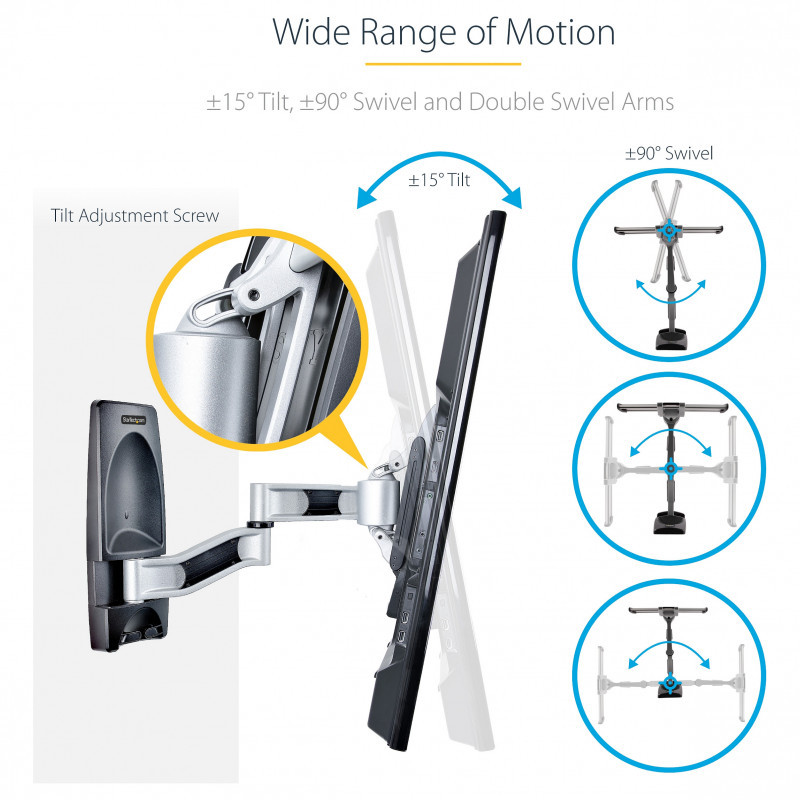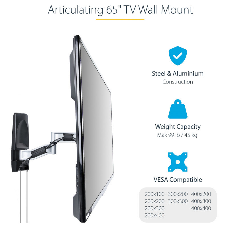 StarTech.com Articulating TV Wall Mount, VESA Wall Mount Supports 65 inch/99lb/Flat/Curved TVs, Retractable Low Profile Wall Mount TV Bracket