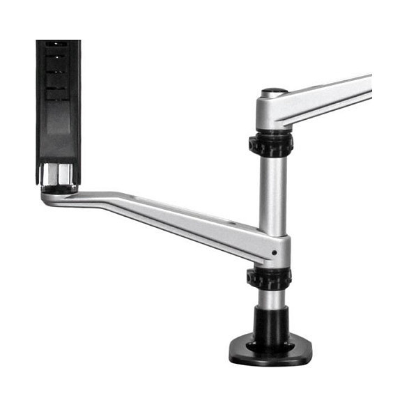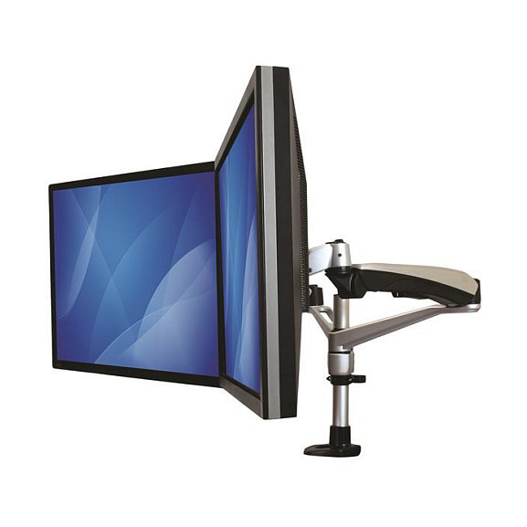 The adjustable dual monitor arm offers a full range of motion on several axes, letting you tilt, pan and rotate. Switch from landscape to portrait viewing.
