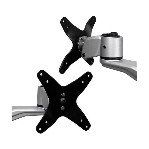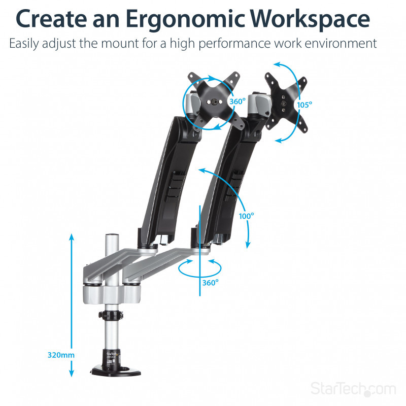 "StarTech.com Desk-Mount Dual Monitor Arm - Full Motion Articulating - Premium. Mounting: Clamp, Maximum weight capacity: 18 kg, Maximum screen size: 76.2 cm (30""), Minimum VESA mount: 75 x 75 mm, Maximum VESA mount: 100 x 100 mm. Height adjustment. Product colour: Black, Silver"\n"Monitor Mount | Height Adjustable | Horizontal or Vertical Setup | Tool-less Assembly