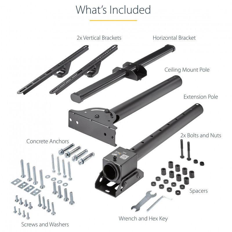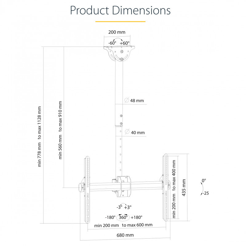 "StarTech.com TV Ceiling Mount - Full-Motion Universal Hanging Single Screen Mount with Adjustable Telescopic Short Pole - Tilt / Swivel - VESA Bracket for 32”-75"" Displays. Maximum weight capacity: 50 kg, Minimum screen size: 94 cm (37""), Maximum screen size: 190.5 cm (75""), Minimum VESA mount: 200 x 200 mm, Maximum VESA mount: 600 x 400 mm. Height adjustment range: 560 - 910 mm, Tilt angle range: -25 - 0°. Product colour: Black"\n"Display Ceiling Mount | Full Motion | For 32"" to 75"" Displays