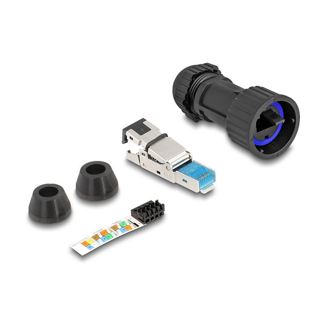 "DeLOCK RJ45 plug field-assembly Cat.6A with feed-through coupler suitable for item 67047 and 67048 IP68 dust and waterproof black. Connector(s): RJ45, Product colour: Black, Connector gender: Male. Outer diameter: 3 cm, Depth: 73 mm. Quantity per pack: 1 pc(s)"\n"This RJ45 plug by Delock can be used to connect network cables. The connector offers quick and easy assembly and ensures secure cable contact.
