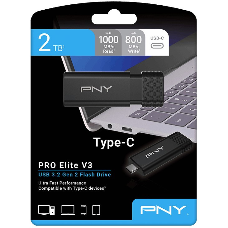"PNY PRO Elite V3. Capacity: 2 TB, Device interface: USB Type-C, USB version: 3.2 Gen 1 (3.1 Gen 1), Read speed: 1000 MB/s, Write speed: 800 MB/s. Form factor: Slide, Product colour: Black"\n"PRO Elite V3 Type-C is the ultimate Type-C storage solution for professional creators, designers, & more! Built for extreme speed, boasting USB 3.2 Gen 2 technology with blazing speeds up to 1000MB/s read & up to 800MB/s write, 265x faster than standard USB 2.0! Enjoy maximum compatibly across mobile devices, laptops & desktops via the Type-C connector, to transfer & store large files faster than ever in a durable premium metal housing!"