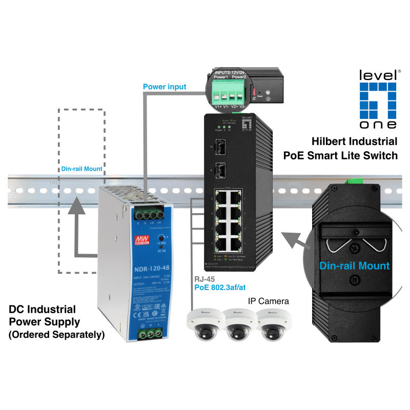 "LevelOne Hilbert 10-Port Industrial Gigabit PoE Smart Lite Switch, 2 x SFP, 8 PoE Outputs, 802.3at/af PoE. Switch type: Managed, Switch layer: L2. Basic switching RJ-45 Ethernet ports type: Gigabit Ethernet (10/100/1000), Basic switching RJ-45 Ethernet ports quantity: 8. Full duplex. MAC address table: 4000 entries, Switching capacity: 20 Gbit/s. Networking standards: IEEE 802.1D, IEEE 802.1Q, IEEE 802.1p, IEEE 802.1w, IEEE 802.3, IEEE 802.3ab, IEEE 802.3af, IEEE.... DC input voltage: 44 - 57 V. Power over Ethernet (PoE)"\n"The LevelOne IGS-2110P Hilbert Industrial gigabit PoE smart lite switch is a next-generation Ethernet Switch offering powerful better PoE functionality and usability that delivers the cost-effectively business and transports Ethernet services via fiber or copper connections. IGS-2110P delivers 8 (10M/100M/1G) RJ45/PoE+ (Support 802.3at/af) ports and 2 Gigabit SFP ports. With the industrial standard DIN-rail mount, plus the clearly visible status LEDs provide simple monitoring of port link activity.. can be matched with the latest LevelOne IP Locator, the software is the easiest to use switch discovery tool, it can search all Hilbert series switches, instantly know the forgotten IP and other info. Compatible with mainstream Windows and Mac operating systems.