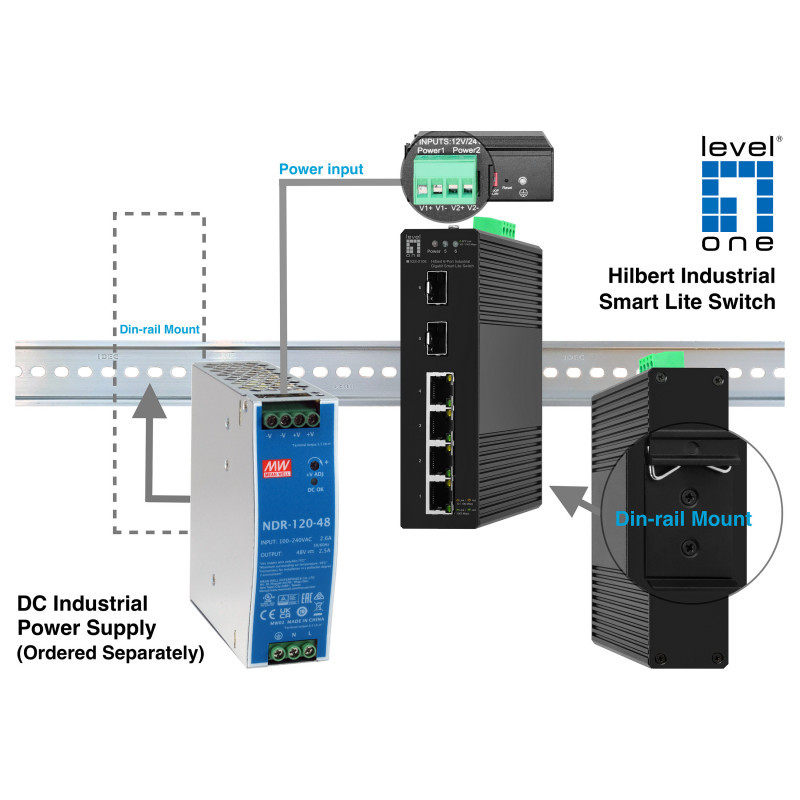 "LevelOne Hilbert 6-Port Industrial Gigabit Smart Lite Switch, 4x RJ45, 2x SFP. Switch type: Managed, Switch layer: L2. Basic switching RJ-45 Ethernet ports type: Gigabit Ethernet (10/100/1000), Basic switching RJ-45 Ethernet ports quantity: 4. Full duplex. MAC address table: 2000 entries, Switching capacity: 12 Gbit/s. Networking standards: IEEE 802.1D, IEEE 802.1Q, IEEE 802.1p, IEEE 802.1w, IEEE 802.3, IEEE 802.3ab, IEEE 802.3az, IEEE.... DC input voltage: 12 - 57 V"\n"The LevelOne IGS-2106 Hilbert Industrial gigabit smart lite switch is a next-generation Ethernet Switch offering powerful better functionality and usability that delivers the cost-effectively business and transports Ethernet services via fiber or copper connections. IGS-2106 delivers 4 (10M/100M/1G) RJ45 ports and 2 Gigabit SFP ports. With the industrial standard DIN-rail mount, plus the clearly visible status LEDs provide simple monitoring of port link activity.. can be matched with the latest LevelOne IP Locator, the software is the easiest to use switch discovery tool, it can search all Hilbert series switches, instantly know the forgotten IP and other info. Compatible with mainstream Windows and Mac operating systems.