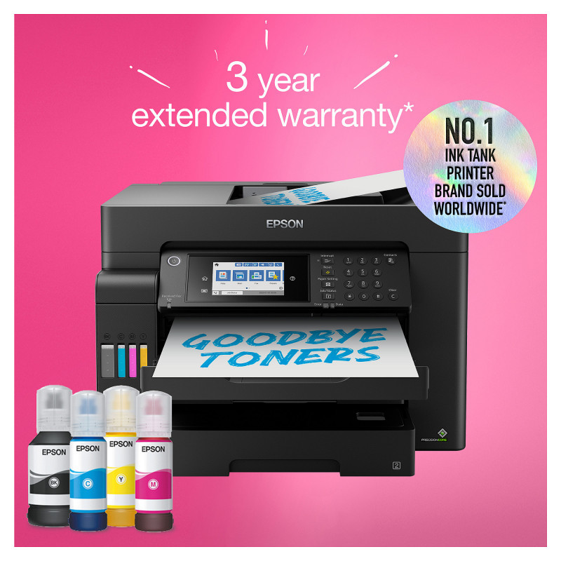 "Epson EcoTank ET-16605. Print technology: Inkjet, Printing: Colour printing, Maximum resolution: 4800 x 2400 DPI, Print speed (colour, normal quality, A4/US Letter): 22 ppm. Copying: Colour copying. Scanning: Colour scanning, Optical scanning resolution: 1200 x 2400 DPI. Faxing: Colour faxing. Duplex functions: Copy, Print, Scan. Maximum ISO A-series paper size: A3. Wi-Fi. Direct printing. Product colour: Black"\n"Get more done in less time