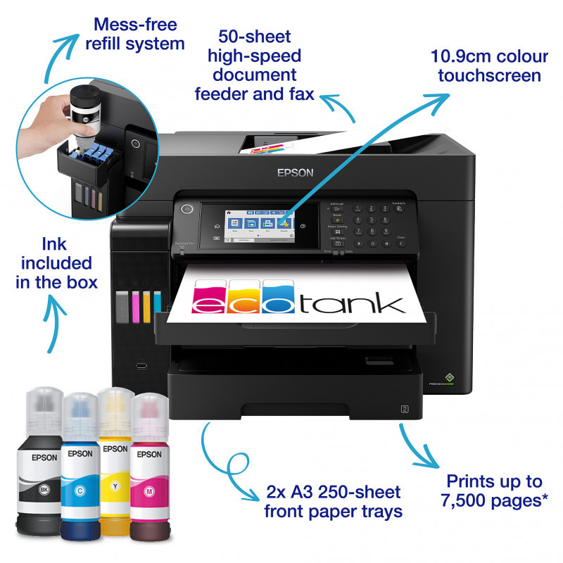 Minimising refills, this EcoTank can print thousands of pages before needing more ink, while the two A3 paper front trays offer a capacity of 500-sheets. Free yourself from manual page loading with a generous 50-sheet rear feed and A3 ADF.