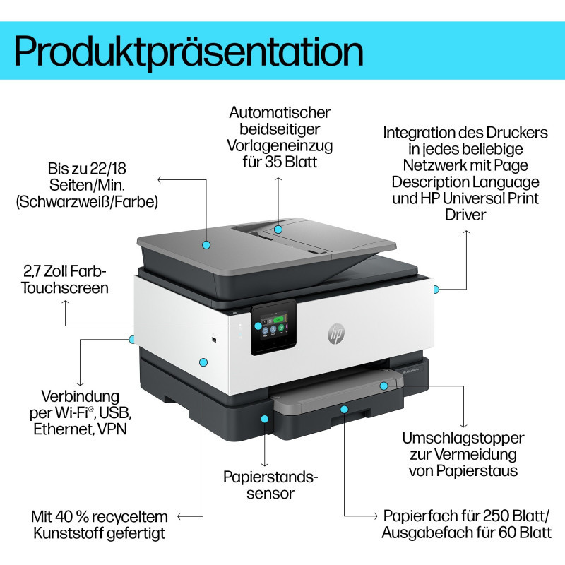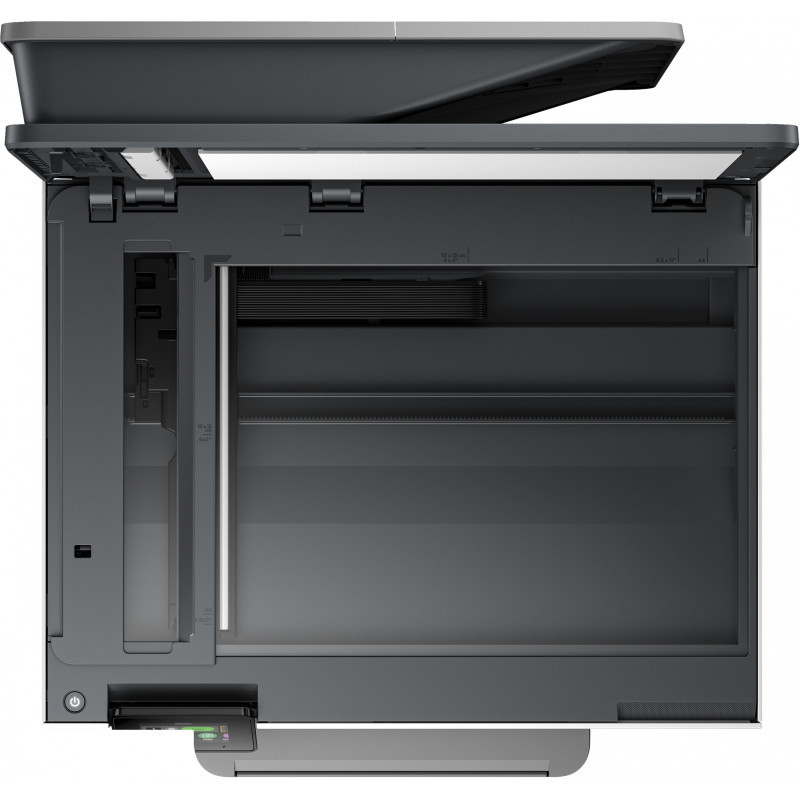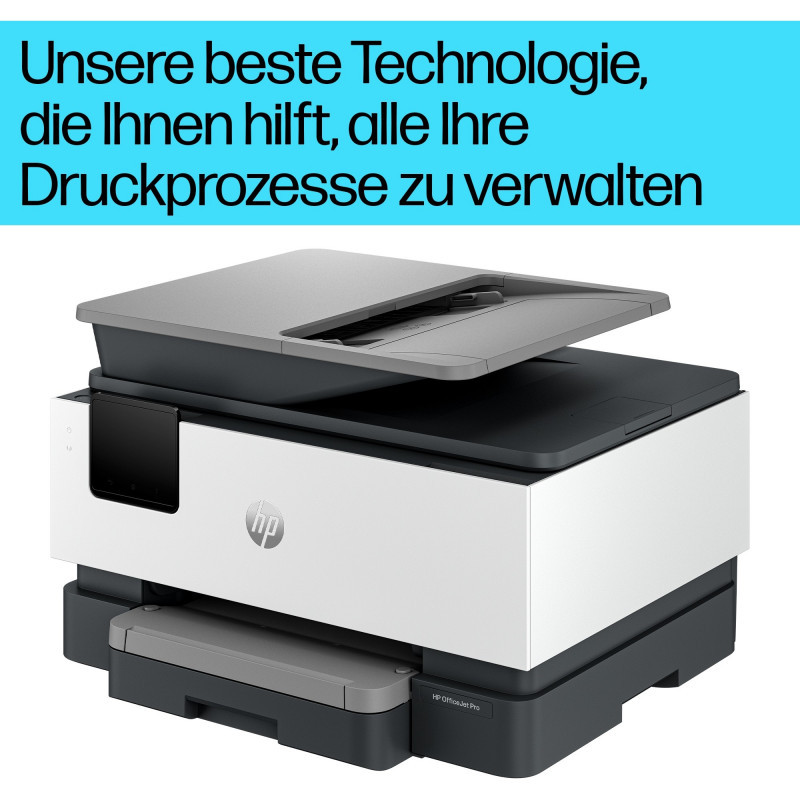 "HP OfficeJet Pro 9120b Wireless All-in-One Color Printer, Two-sided printing; Copier, Scanner. Print technology: Thermal inkjet, Printing: Colour printing, Maximum resolution: 4800 x 1200 DPI, Print speed (colour, normal quality, A4/US Letter): 16 ppm. Copying: Colour copying, Maximum copy resolution: 600 x 600 DPI. Scanning: Colour scanning, Optical scanning resolution: 1200 x 1200 DPI. Faxing: Colour faxing. Duplex functions: Print, Scan, Fax. Maximum ISO A-series paper size: A4. Wi-Fi. Direct printing. Product colour: Grey"\n"Manage printing like a Pro. The professional colour inkjet printer for distributed offices and hybrid workforce from the World’s #1 Printer Company, paired with our best technology to help manage it all. This streamlines work into any network. Scan/copy/fax included.[1,2].
