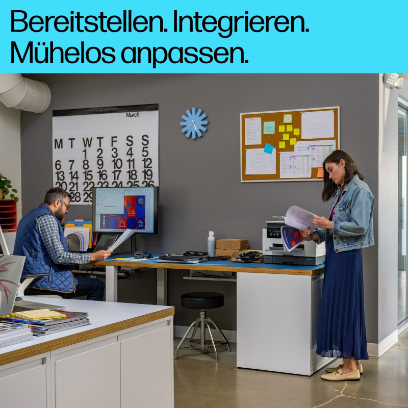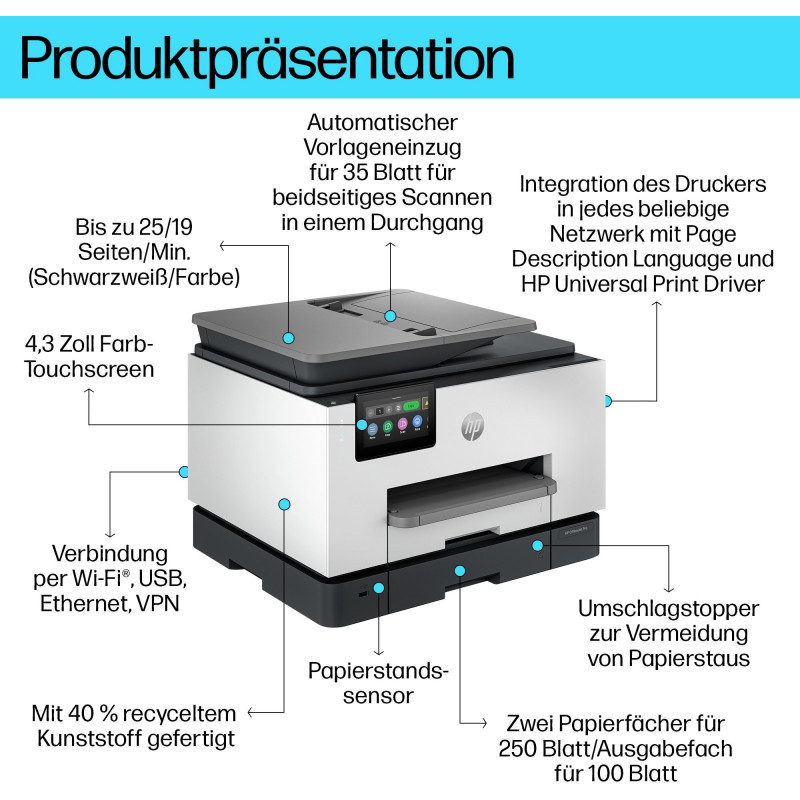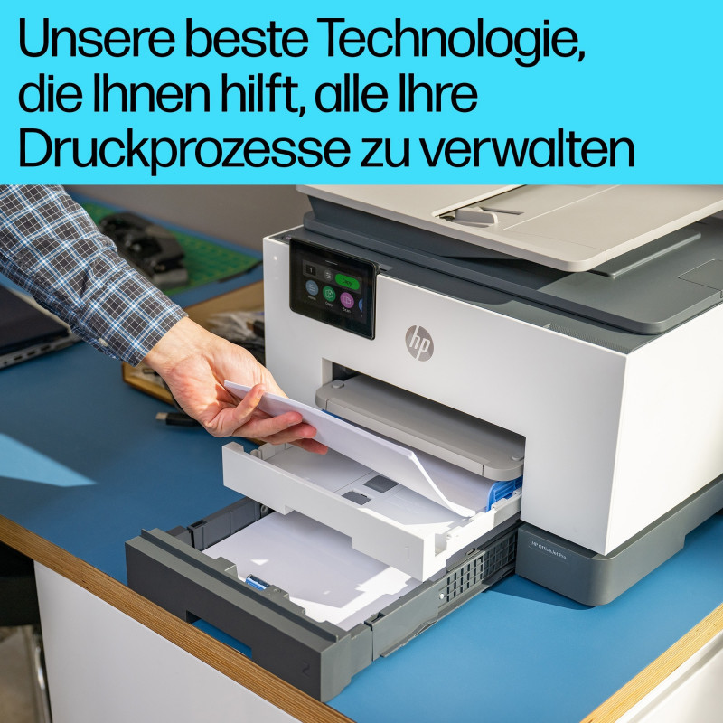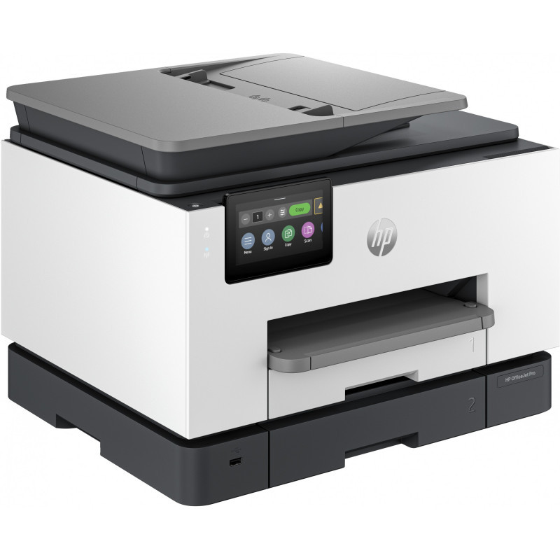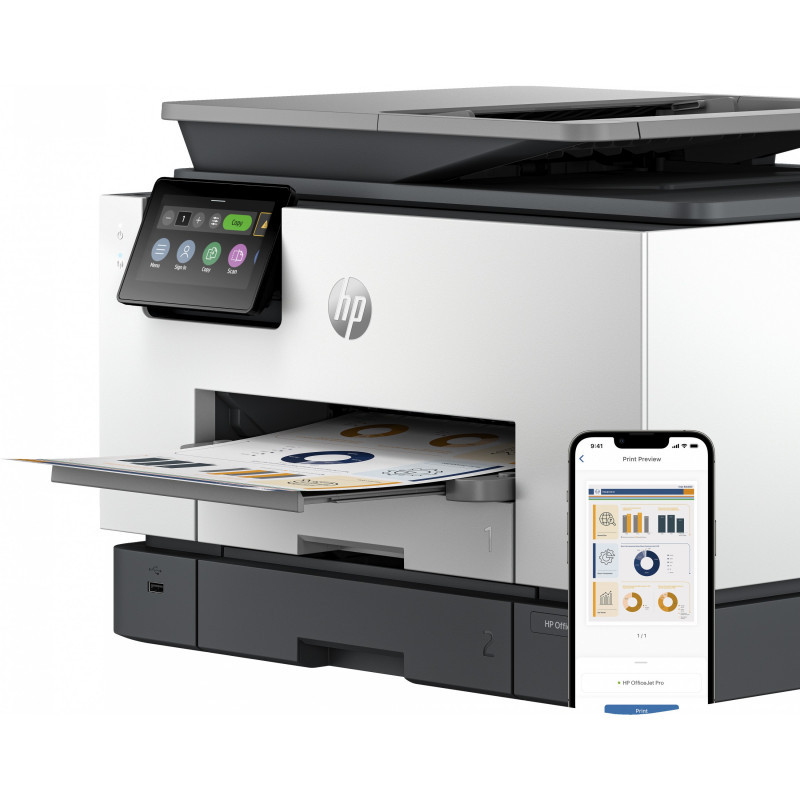 "HP OfficeJet Pro 9130b Wireless All-in-One Color Printer, Two-sided printing; Copier, Scanner. Print technology: Thermal inkjet, Printing: Colour printing, Maximum resolution: 4800 x 1200 DPI, Print speed (colour, normal quality, A4/US Letter): 19 ppm. Copying: Colour copying, Maximum copy resolution: 600 x 600 DPI. Scanning: Colour scanning, Optical scanning resolution: 1200 x 1200 DPI. Faxing: Colour faxing. Duplex functions: Print, Fax. Maximum ISO A-series paper size: A4. Wi-Fi. Direct printing. Product colour: Grey"\n"Manage printing like a Pro. The professional colour inkjet printer for distributed offices/hybrid workforce from the World’s #1 Printer Company, paired with our best technology to help manage it all. This streamlines work into any network with extra performance features.[1,2].
