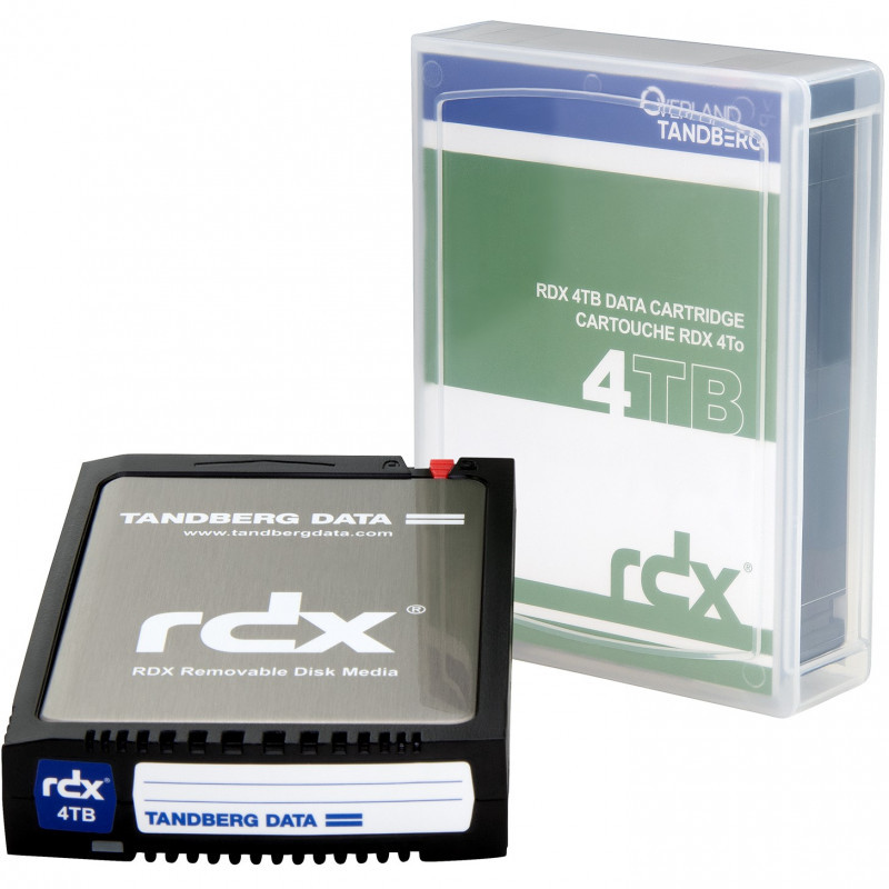"Overland-Tandberg O-T RDX HDD 4TB Cartridge (single). Product type: RDX cartridge, Media type: RDX, Native capacity: 4 TB. Transfer rate: 150 MB/s. Width: 87 mm, Depth: 23 mm, Height: 119 mm. Quantity per pack: 1 pc(s). Mean time between failures (MTBF): 550000 h"\n"The HDD-based RDX data cartridges are ideal for backup, restore and long term archiving tasks. With capacities from 500GB, 1TB, 2TB, 4TB to 5TB, the HDD-based RDX cartridges fit perfect in every individual environment."