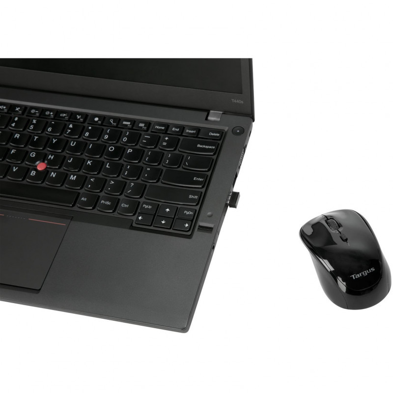 "Targus AMW50EU. Form factor: Ambidextrous. Movement detection technology: Blue Trace, Device interface: RF Wireless, Movement resolution: 800 DPI, Buttons type: Pressed buttons, Scroll type: Wheel. Power source: Batteries. Works on any surface. Product colour: Black"\n"The Targus Blue Trace Wireless Mouse, features the latest Blue Trace technology for accurate and precise tracking.