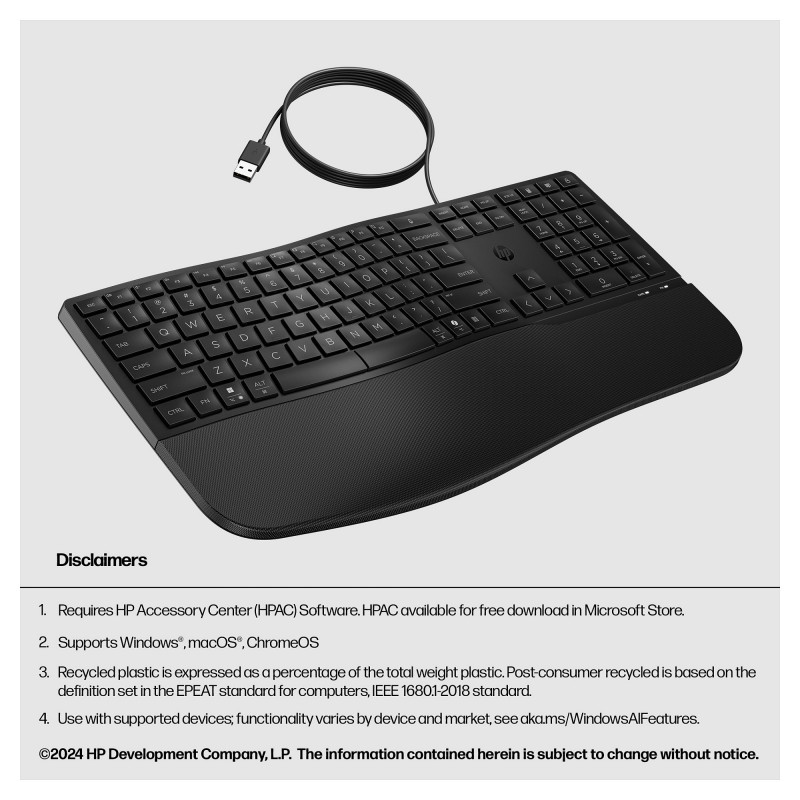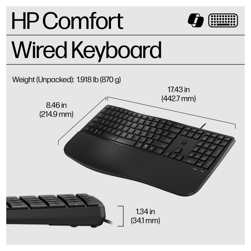 The HP 480 Comfort Wired Keyboard is designed to naturally fit your lifestyle as you type throughout the day. Featuring programmable keys[1], adjustable angle, and multi-OS[2] capability, this keyboard was built for you."