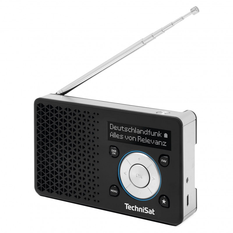 "TechniSat DIGITRADIO 1 A. Radio type: Portable, Tuner type: Analog & digital, Supported radio bands: DAB+, FM. RMS rated power: 1 W. Display type: OLED. Headphone connectivity: 3.5 mm, USB connector type: USB Type-C. Product colour: Black, Silver, Volume control: Buttons, On Screen Display (OSD) languages: Czech, Danish, German, Dutch, English, French, Italian, Norwegian, Polish, Slovenian, Swedish"\n"DAB+ Digital radio ""Made in Germany!"" The DIGITRADIO 1 A has been both developed and produced in Germany and has a stunningly distinctive look. The large, chrome-plated control dial and neat functional buttons on the front allow very easy navigation through the menus, which appear on the clear OLED display. The built-in speaker is protected by a special grille with a distinctive design. The device is also notable for its high level of mobility. The housing contains a powerful rechargeable battery which can be effortlessly replaced and provides up to 10 hours of radio pleasure when you're on the go. Moreover, you can programme and save up to 20 favourite stations for both DAB+ and USW."