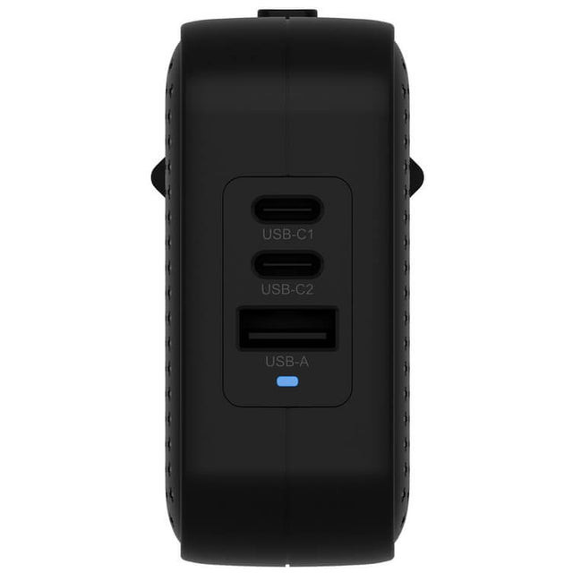 "HYPER HyperJuice 70W USB-C GaN Travel Charger - Black. Charger type: Indoor, Power source type: AC, Charger compatibility: Laptop, Smartphone, Tablet, USB 2.0 ports quantity: 1, USB Type-C ports quantity: 2, Fast charging. Product colour: Black"\n"The HyperJuice 70W USB-C GaN Travel Charger can power up to 3 devices simultaneously with its two USB-C ports and one USB-A port, allowing you to fast charge your laptop, phone, tablet, or headphones. It has everything you need for global travel, thanks to its compact design and included travel adapters. Additionally, it easily transforms into a flexible desktop charger with the included C8 adapter. It’s the perfect solution for staying charged and connected, no matter where you are in the world.