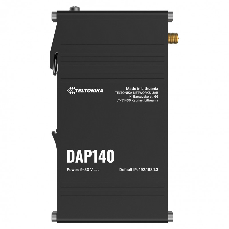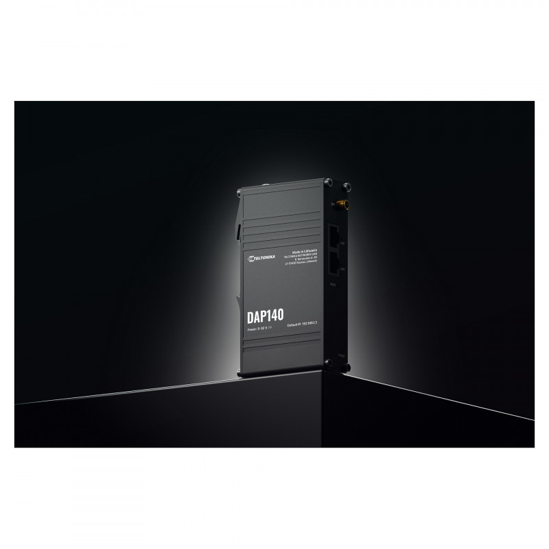"Teltonika DAP140. 2.4 GHz, Maximum data transfer rate: 300 Mbit/s. Security algorithms: OWE, WPA-EAP, WPA-PSK, WPA2-EAP, WPA2-PSK, WPA3-EAP, WPA3-SAE. Ethernet LAN data rates: 10,100,1000 Mbit/s. Power over Ethernet (PoE). Product colour: Black"\n"The DAP140 is a Teltonika industrial wireless access point with passive PoE-in, designed to enhance Wi-Fi coverage and performance in industrial environments. Featuring Wi-Fi 4 with Wi-Fi mesh and Fast Roaming, as well as dual RJ45 ports and support of up to 50 simultaneous connections, this wireless access point is integral in maintaining reliable connectivity. An integrated DIN rail bracket, 3-pin power connector, and industrial-grade aluminium housing make the DAP140 the ideal access point for industrial applications."