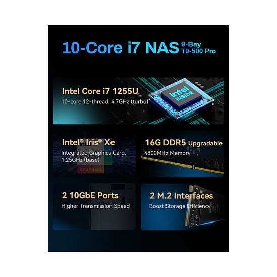"TerraMaster T9-500 PRO. Type: NAS. Chassis type: Desktop. Device class: Home & Home Office. Processor family: Intel® Core™ i7, Processor frequency: 2.4 GHz. Internal memory: 16 GB, Internal memory type: DDR5. Total installed storage capacity: 0 TB"\n"High-Performance Backup Server: The T9-500 Pro NAS storage is powered by Core i7-1255U processor with 10 cores, 12 threads, and turbo speeds up to 4.7GHz. It features Iris Xe Graphics with a 1.25GHz dynamic frequency and supports AES NI hardware encryption. Equipped with 16GB DDR5 memory and dual 10 Gigabit Ethernet ports, it delivers strong performance. Its two M.2 NVMe slots enhance storage efficiency with Hyper Cache. This makes the T9-500 Pro a top choice for high-performance backup solutions for small to medium-sized businesses.